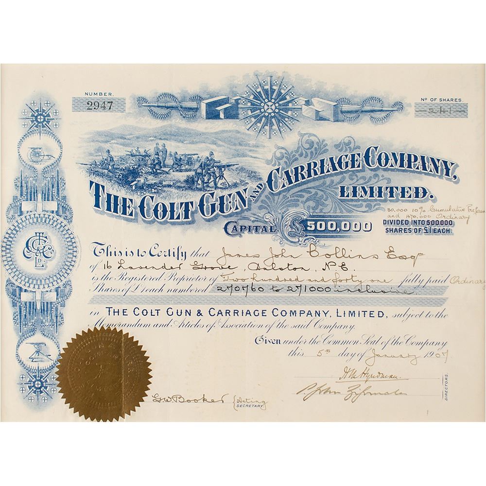Founded in 1899 by senior British military officials, the Colt Gun and Carriage Company acquired the patents for the Colt cannon and the Dundonald machine gun in Great Britain and Europe. Stock certificates for the company are scarce and highly sought-after for their great graphics.