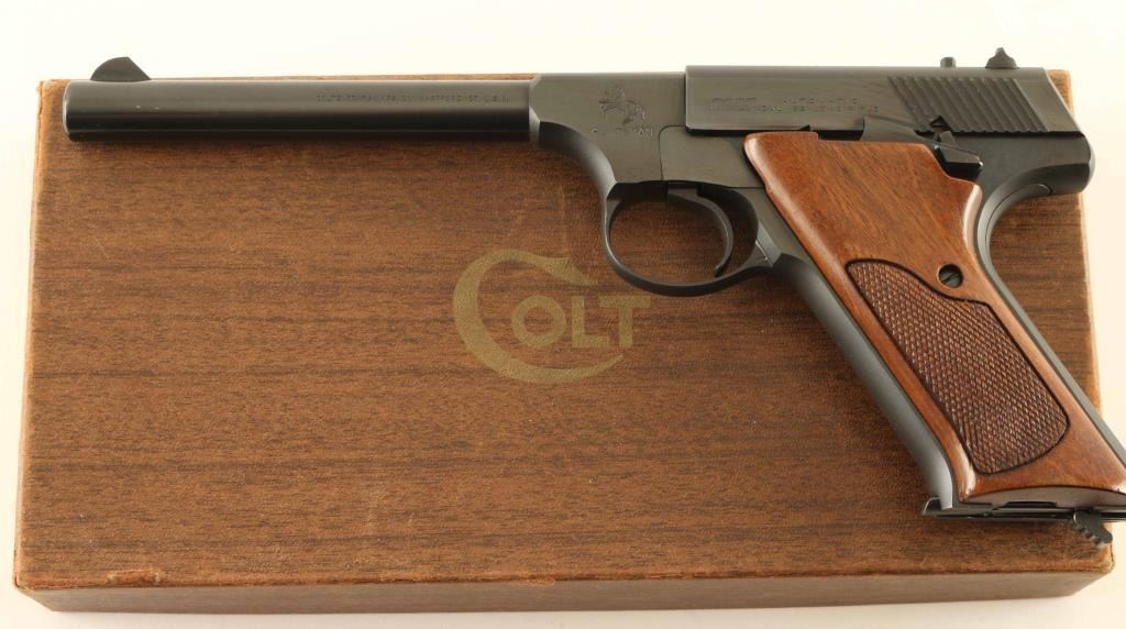 'Third Series' Vintage single action semi-automatic target pistol chambered in .22 Long Rifle, manufactured circa 1969. Features a matte/polished blued finish, 6" round barrel, serrated blade front sight, dovetailed rear sight with square notch, smooth wide trigger, thumb safety/slide catch on the left slide of the frame, heel magazine release, 10 round factory magazine, steel frame and two piece checkered walnut grips. Includes the original two-piece wood grain cardboard box with documents and matching label. Pistol exhibits approximately 98% of it's original blued finish showing minor muzzle wear and a few small blemishes on the barrel with no other wear observed. Action is smooth, the bore shows a light ring cut only into the lands near the muzzle but is otherwise excellent, markings are crisp and the wood grips are good+ with moderate wear. Condition is near NRA Excellent in box. ***C&R Firearm***