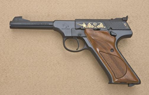 Colt Huntsman, .22 caliber semi-automatic pistol, master series, with gold ornamentation and fancy factory display box, serial #31589S, one of only 400 issued. The pistol is excellent to mint, 99% plus,showing slight storage, no use. Some slight scratches on exterior of case. From the Robert Petersen collection. Est: $600 - $1,200