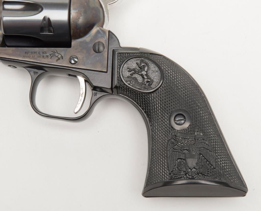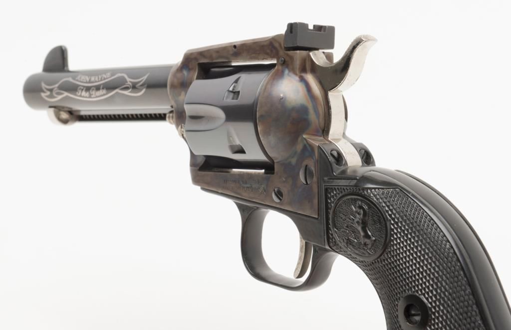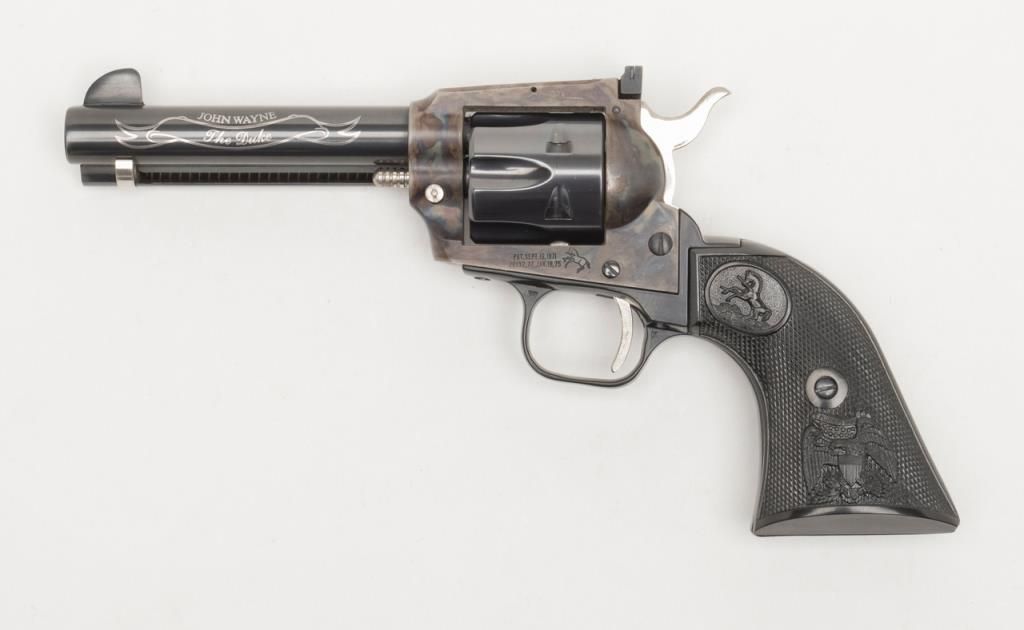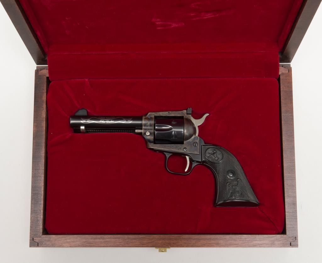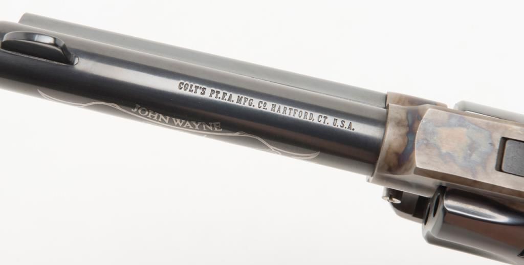 Colt John Wayne Frontier Scout Commemorative, #G212801, .22 cal., 4 3/8" barrel, color case hardened frame with blued barrel, adjustable sights, in wooden display case. Revolver is in excellent condition overall, showing no evidenceof use. Wooden case is in fine condition overall, showing minor scratches and minimal mars from handling. The case is etched with the Colt logo and "The Duke" in script lettering, and is red felt lined. (C&R / PPT) Est.: $400-800.
