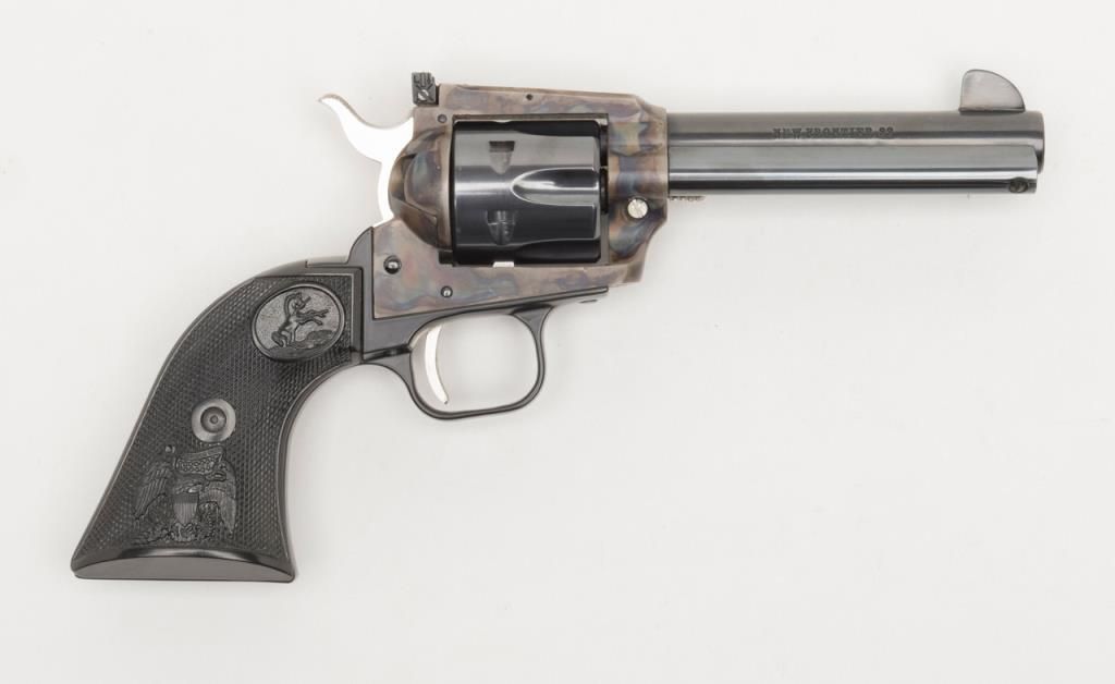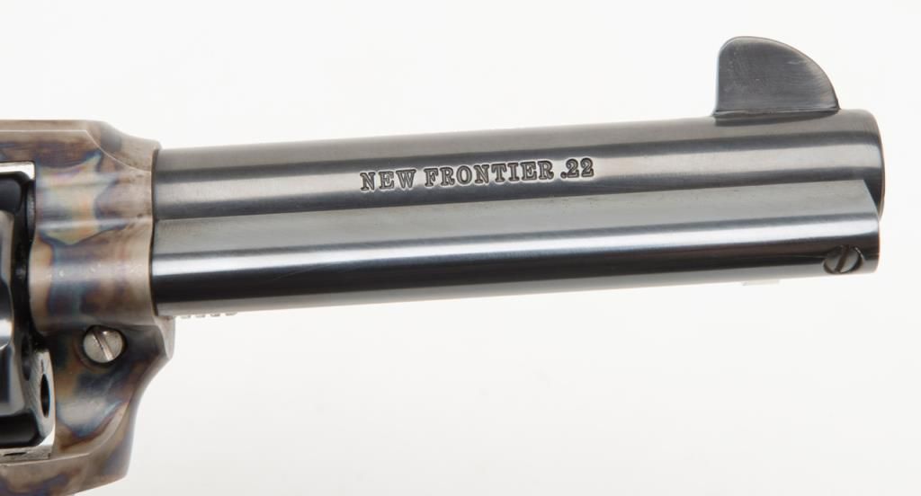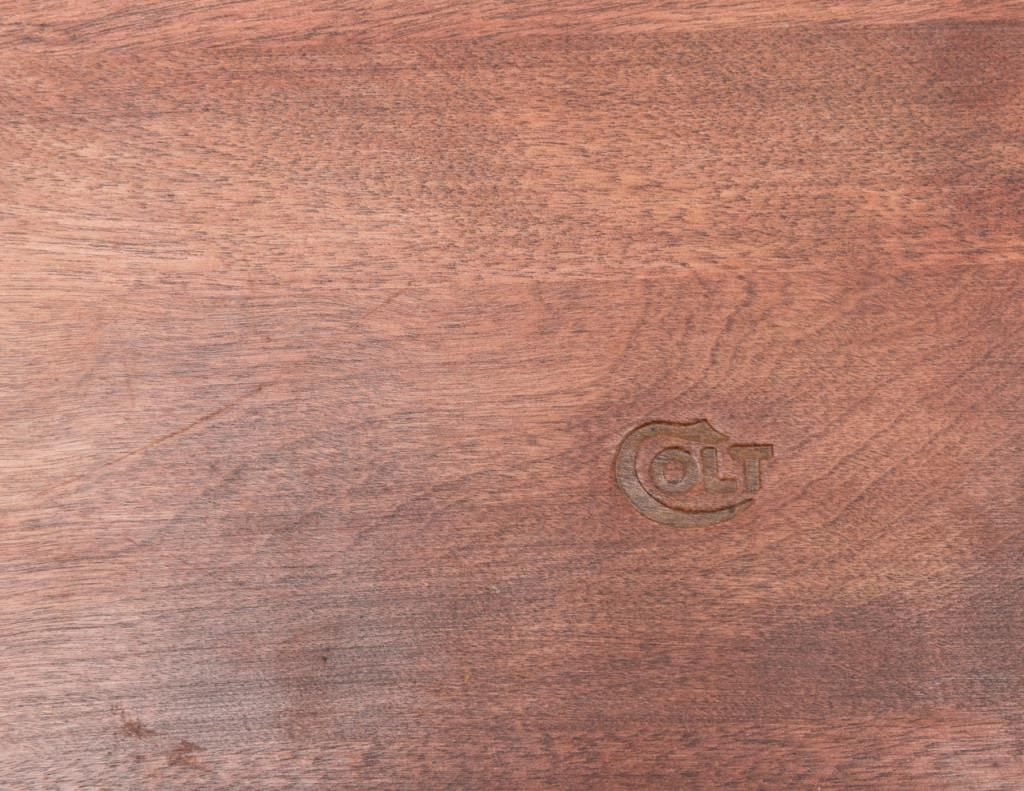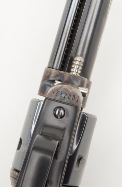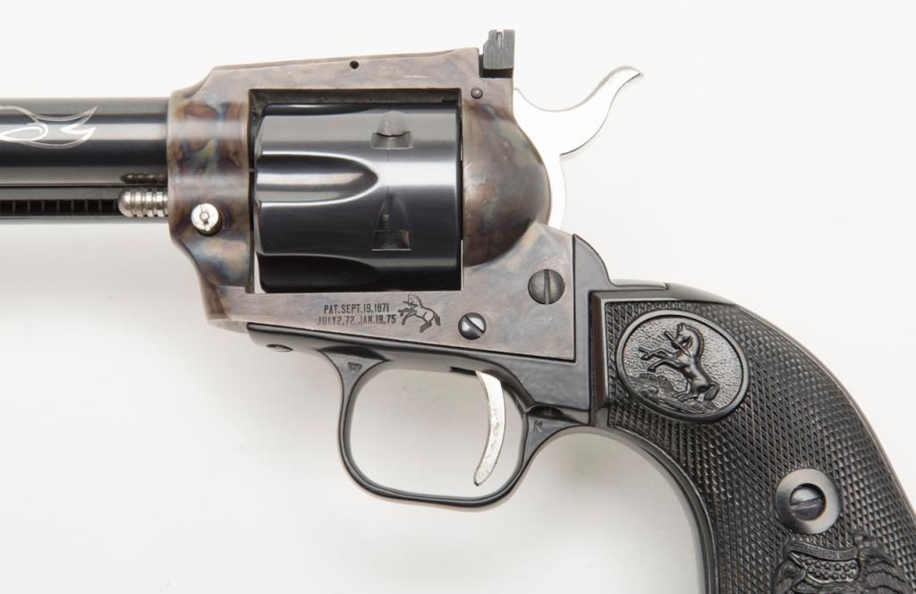 Colt John Wayne Frontier Scout Commemorative, #G212801, .22 cal., 4 3/8" barrel, color case hardened frame with blued barrel, adjustable sights, in wooden display case. Revolver is in excellent condition overall, showing no evidenceof use. Wooden case is in fine condition overall, showing minor scratches and minimal mars from handling. The case is etched with the Colt logo and "The Duke" in script lettering, and is red felt lined. (C&R / PPT) Est.: $400-800.