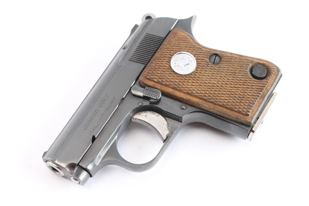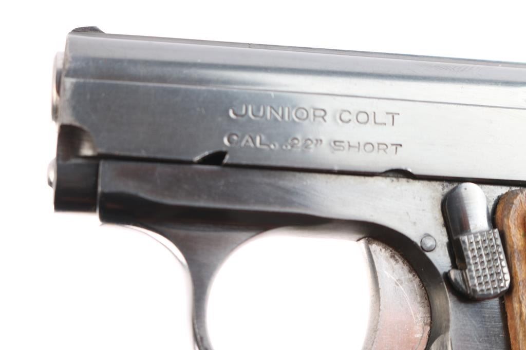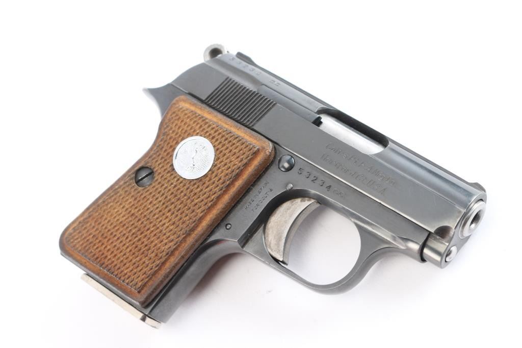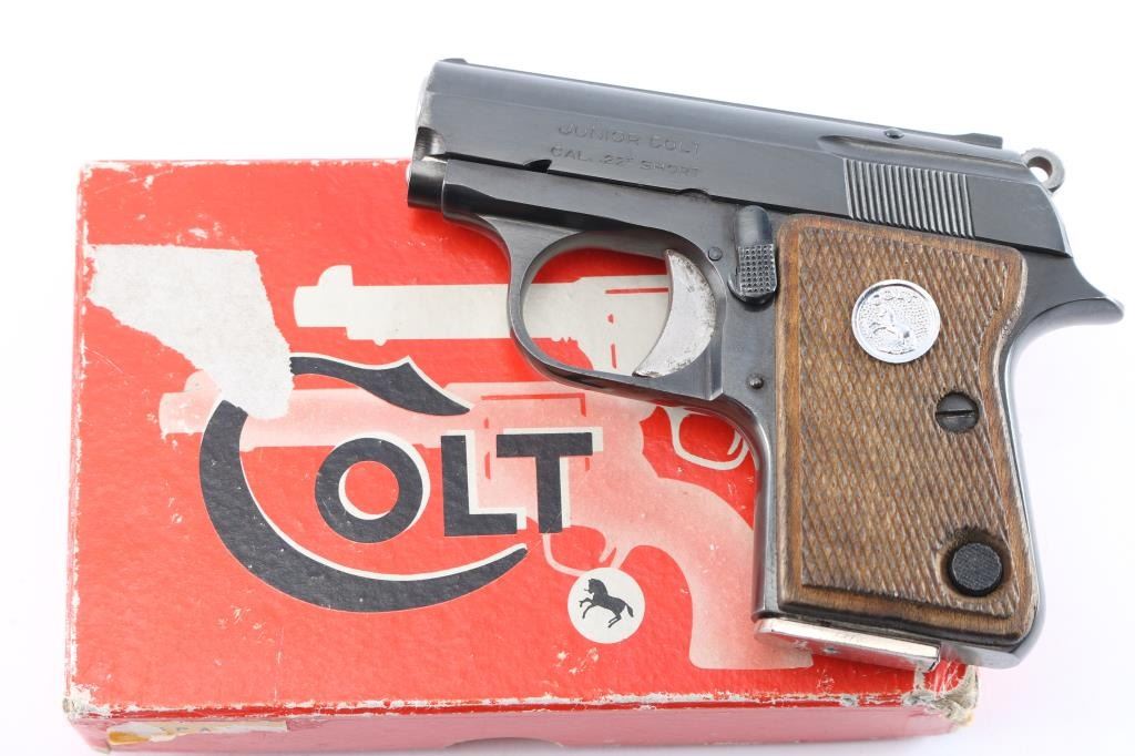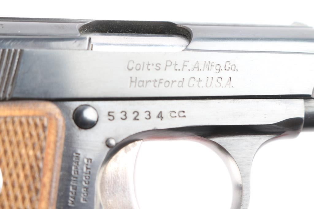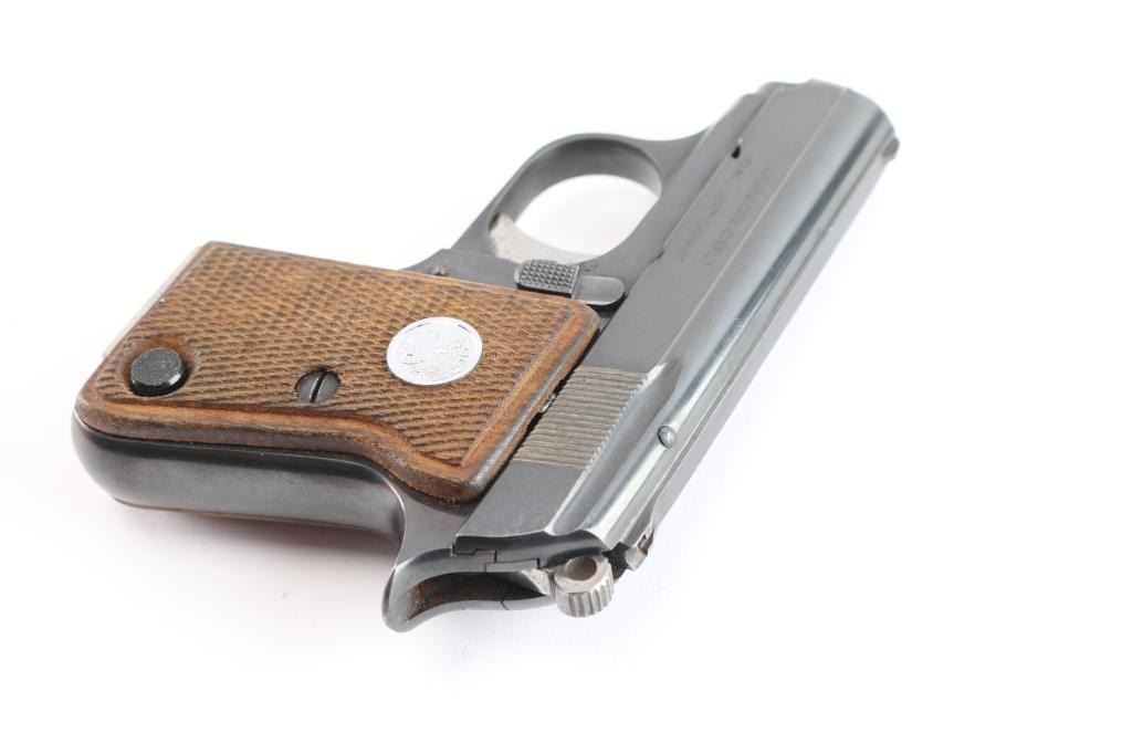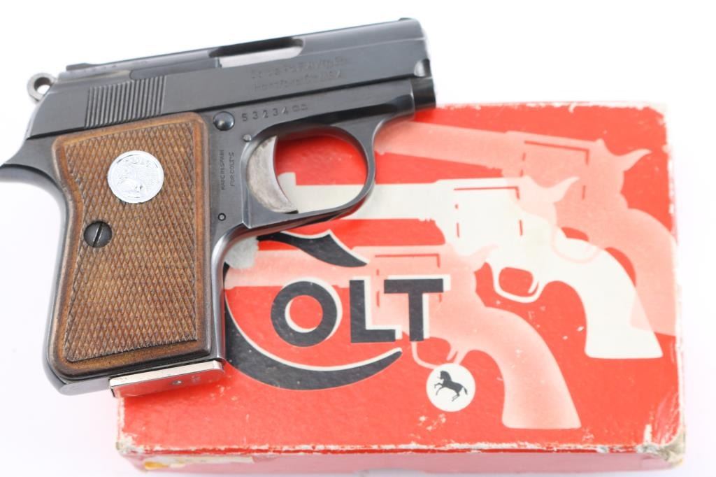 Produced in Spain by ASTRA for COLT, circa 1967. 1958-1968 (Spanish-made), 1971-1973 (US-made). pocket size single action rimfire semi automatic pistol. Features a blue finish, 2.25" barrel, fixed sights, smooth trigger, serrated round hammer spur, push button magazine release, factory nickel plated 6 round magazine, manual safety/slide catch, magazine safety, Colt medallion checkered wood grips. standard Colt markings with "Made in Spain for Colt" stamped on the right frame. Gun is in overall excellent condition with few minor blemishes, bore is excellent/bright. Comes with original red cardboard box with matching label, Colt manual and Astra 'CUB' manual. Also included is a receipt from Korn Loan & Jewelry Co. Lawndale, CA dated 11-17-1967 where the pistol was sold for $31.50.