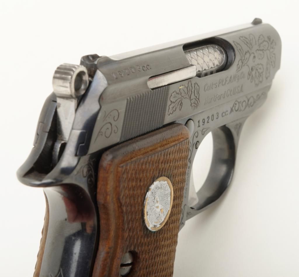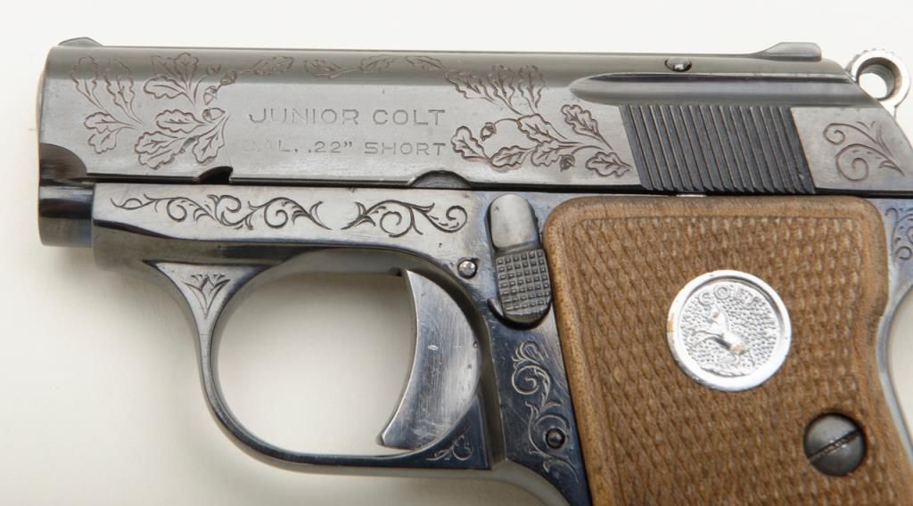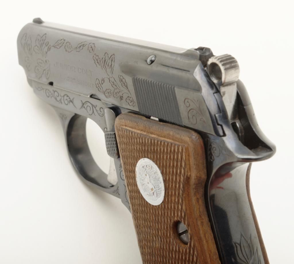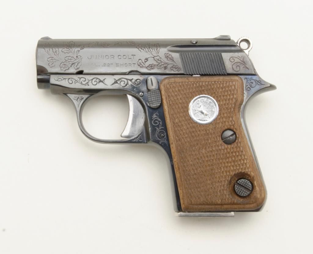 Colt Junior Model semi-auto pistol, .25 cal., 2” barrel, #19203CC in overall fine condition showing oak leaf engraving and refinishing at time of engraving; with factory cardboard box and instructions. (Modern/PPT). Est.: $250-$500.