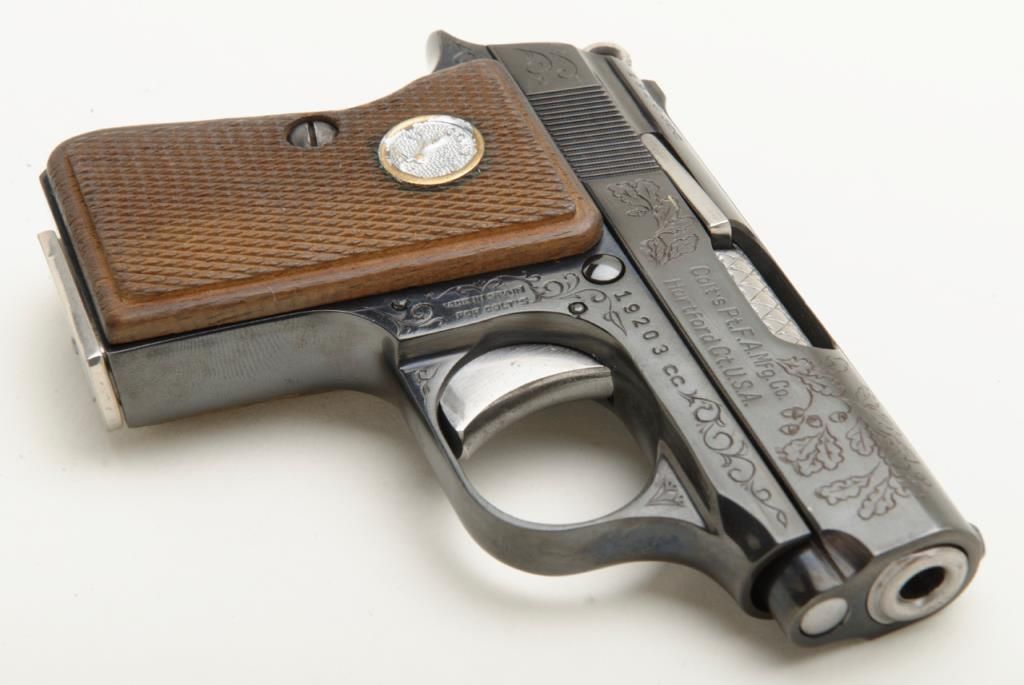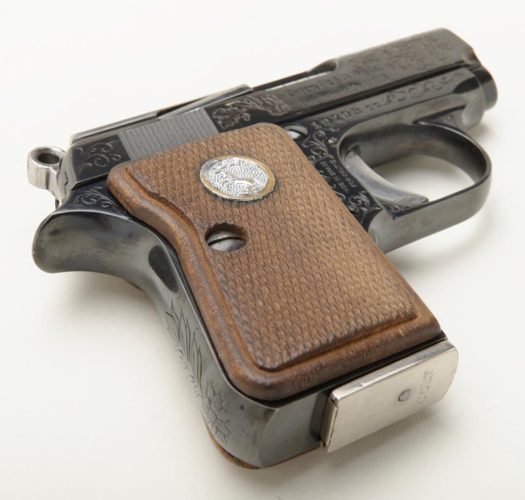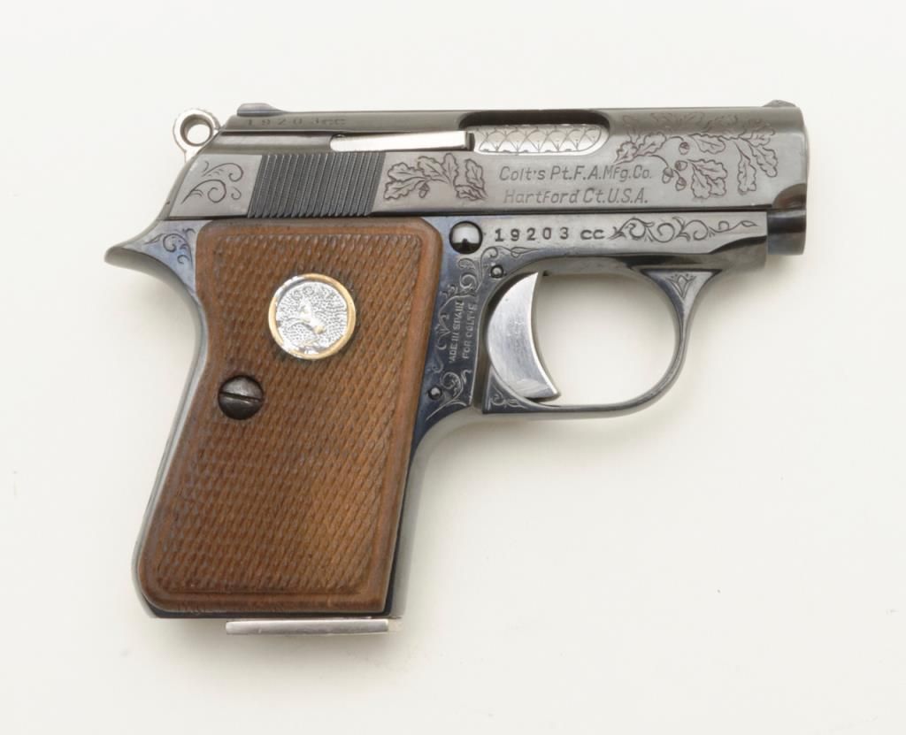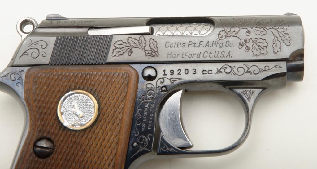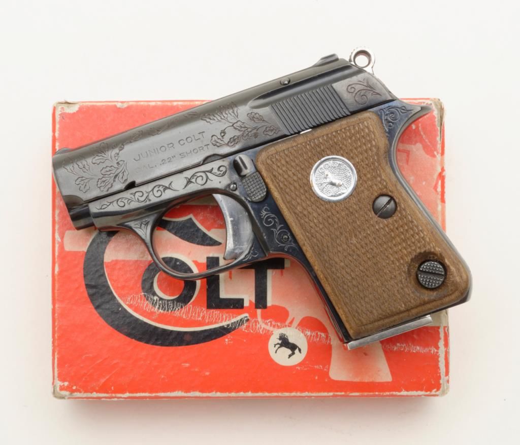 Colt Junior Model semi-auto pistol, .25 cal., 2” barrel, #19203CC in overall fine condition showing oak leaf engraving and refinishing at time of engraving; with factory cardboard box and instructions. (Modern/PPT). Est.: $250-$500.