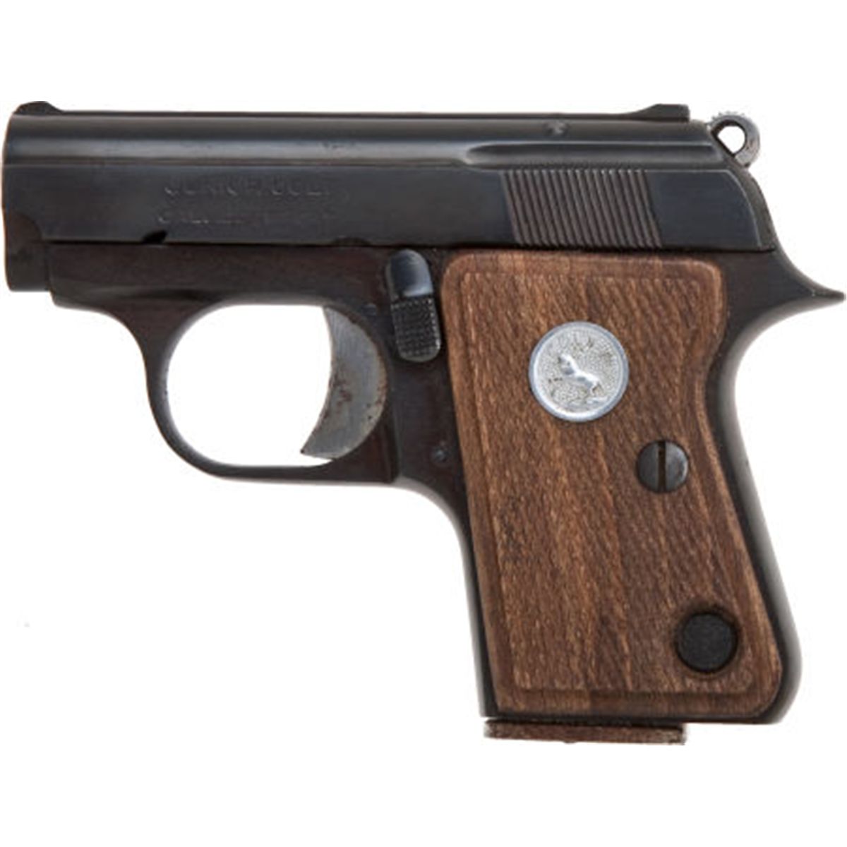 Colt Junior Semi-Automatic Pocket Pistol. Serial no. 54422, .22 caliber, 2 1/4-inch barrel. Blued finish. Checkered walnut grips with medallions. Condition: Excellent with light handling and storage wear present.NRA FIREARMS FOR FREEDOM PROGRAM