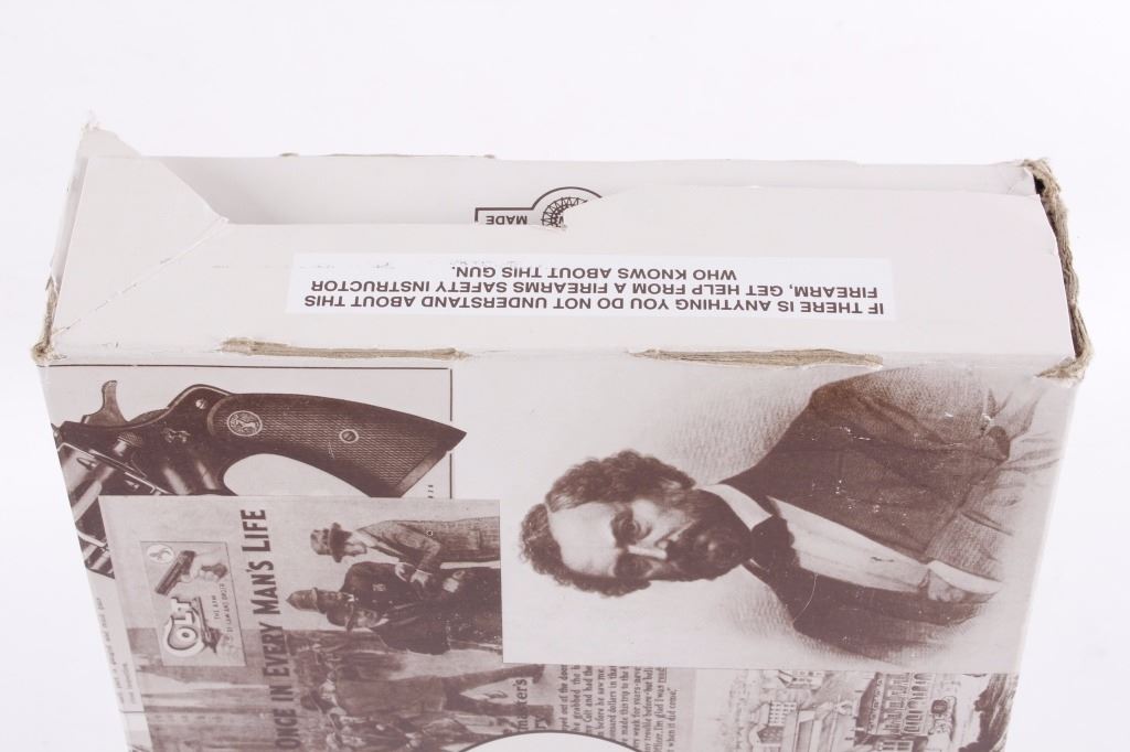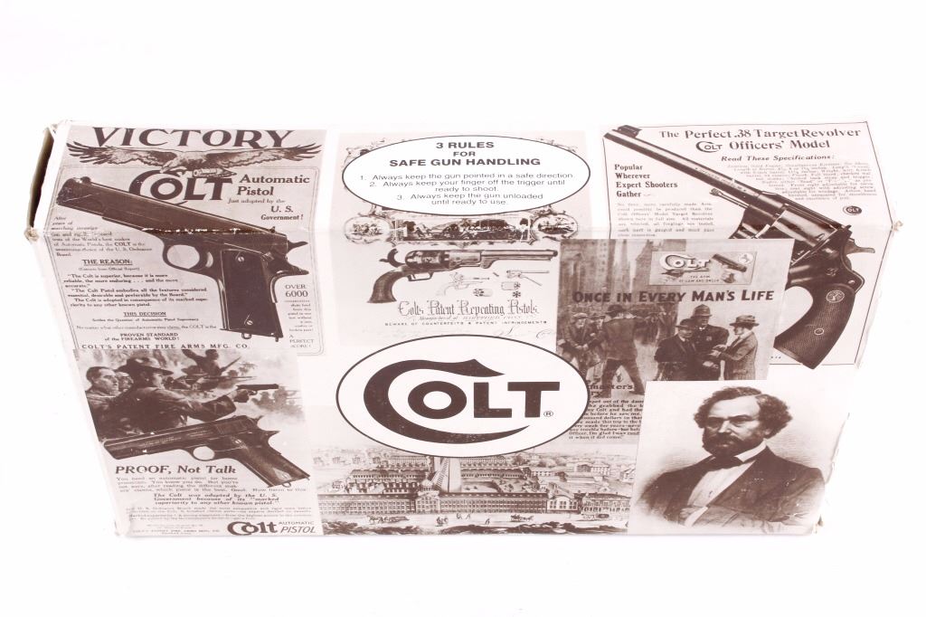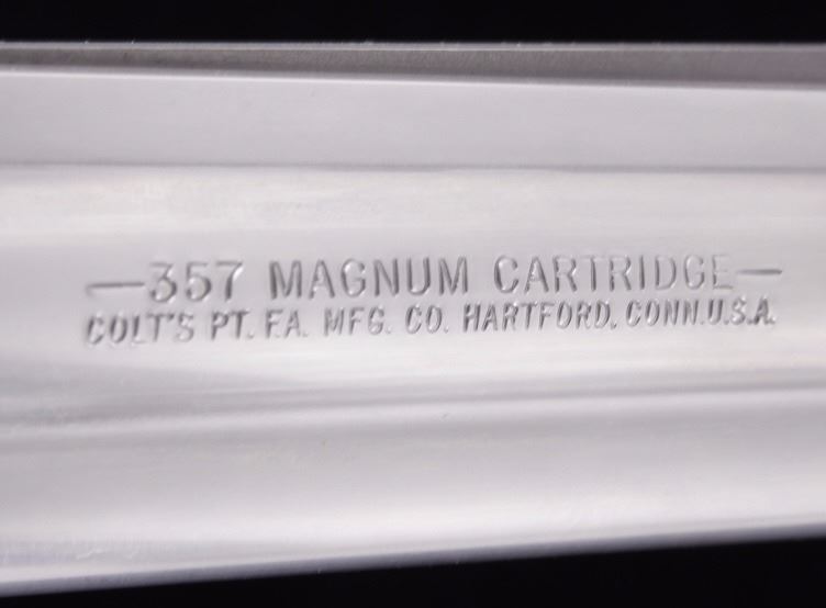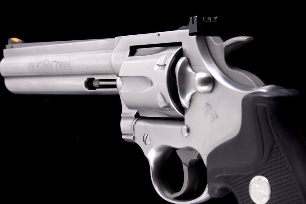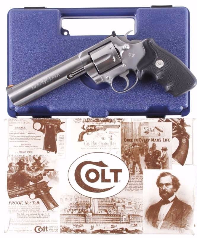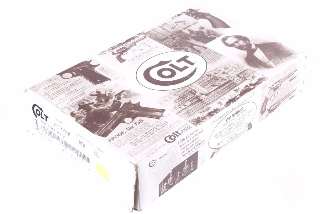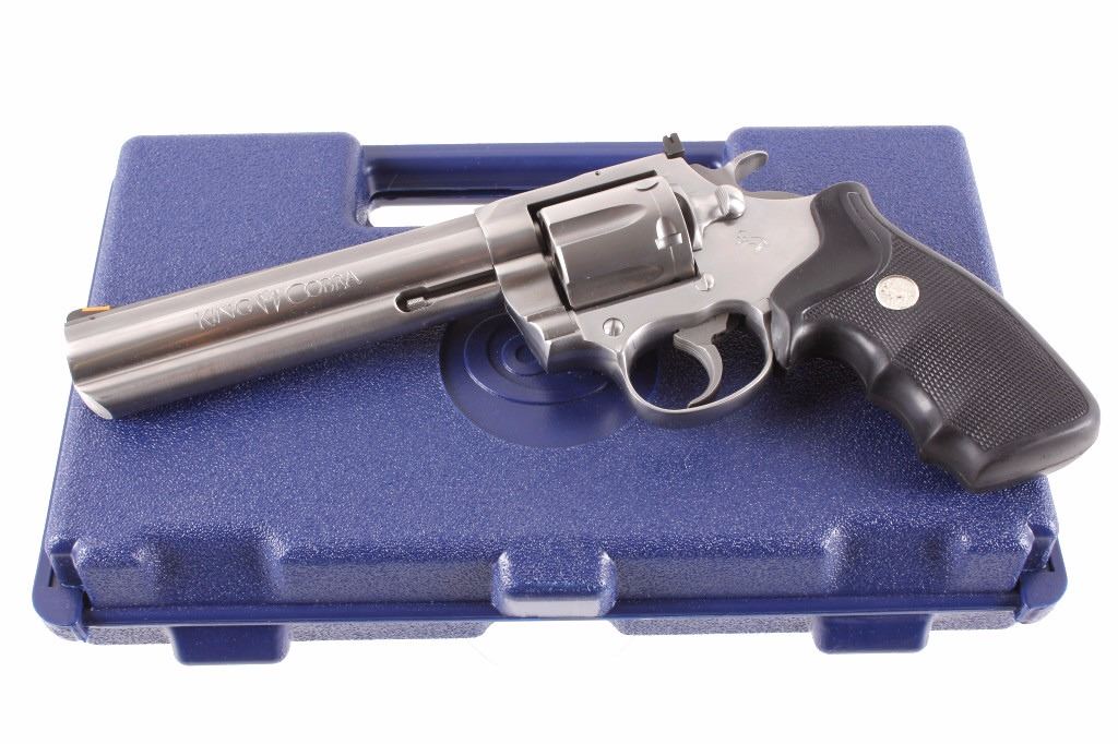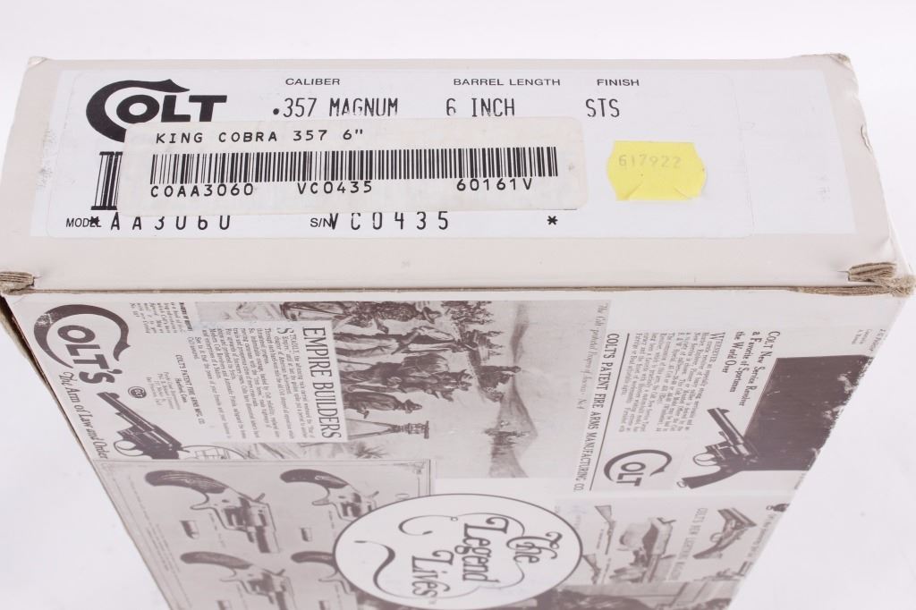 This is an excellent Colt King Cobra double action revolver chambered in .357 Magnum and 38 Special cartridges. The revolver is in like new in the box condition showing 99%+ finish. The revolver shows a stainless steel finish with a 6 inch fully ribbed barrel having a full length barrel underlug. . This also features a wide serrated target hammer, fully adjustable target sights, and fixed front sight. The pistol shows the factory original black hard rubber finger grooved combat style grips marked Colt with the Colt round medallion inlaid. The revolver comes in the original hard blue Colt case with matching serial number and paperwork along with the paper Colt box. The Colt Model AA3060 has a serial number of VC0435 and was manufactured in 1992. In 1986 Colt upgraded the Colt Trooper Mark V in stainless, renaming it the King Cobra, in response to the huge popularity of the Colt Python. The King Cobra was marked with the Cobra Head logo, breaking the tradition of having only the name and caliber on the barrel. The King Cobra was discontinued in 1998. Modern Handgun requires FFL Transfer or NICS Background check. Marked on left side, “KING (cobra head) COBRA – VP (in triangle) (Colt’s Prancing Pony logo).” Marked on right side, “-357 MAGNUM CARTRIDGE- COLT’S PT. F.A. MFG. CO. HARTFORD. CONN. U.S.A.”