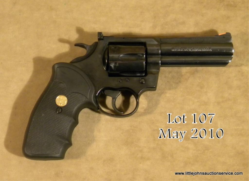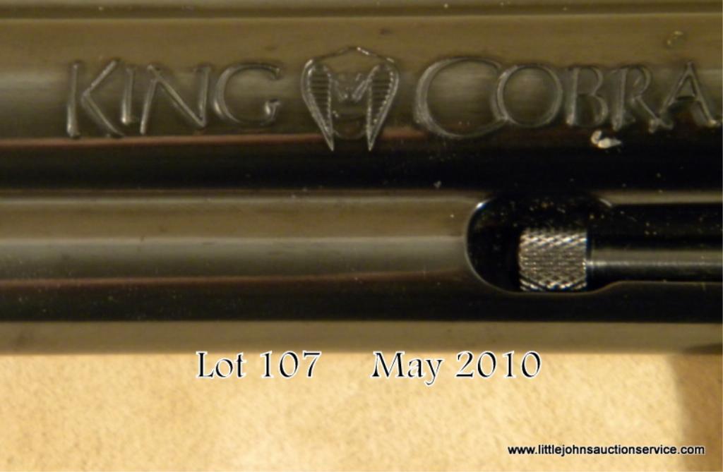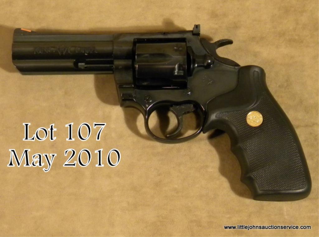Colt King Cobra Model DA revolver, .357 Magnum cal., 4” barrel, blue finish, Colt medallion wrap around finger groove checkered hard rubber combat grips, #7938CK. This gun is in overall excellent condition showing approx. 98%+ original finish,fine bore, action and markings; excellent grips, adjustable rear sight and red insert ramp front sight. Est.: $250-$450.