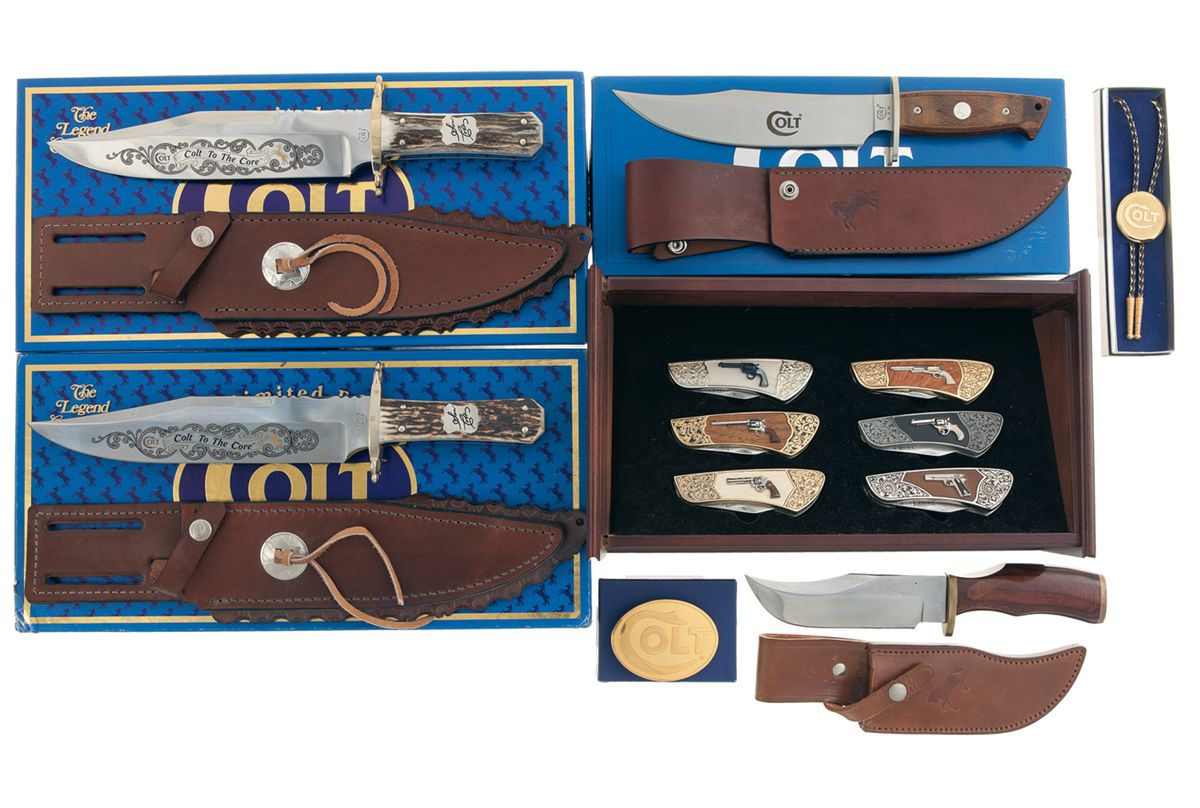 Colt bowie knife with sheath and box, 2 Colt 1995 Limited Edition "Colt to the Core" bowie knives each with sheath and box, Colt Mountaineer knife with sheath (very good), belt buckle with box, bolo with box, 6 pocket knives with display case. Unless notes, items are excellent.