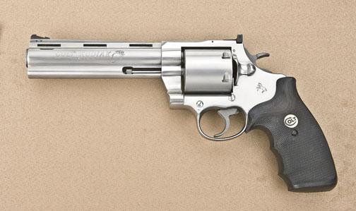 Colt Kodiak Model DA stainless steel revolver, .44 Magnum, 6” ventilated rib barrel, Colt finger groove checkered hard rubber grips, #CKA0696. This gun is in overall excellent condition with a non-fluted cylinder, fine bore, action, markings and grips; accompanied by a factory Colt blue plastic carry case. Est.: $450-$900.