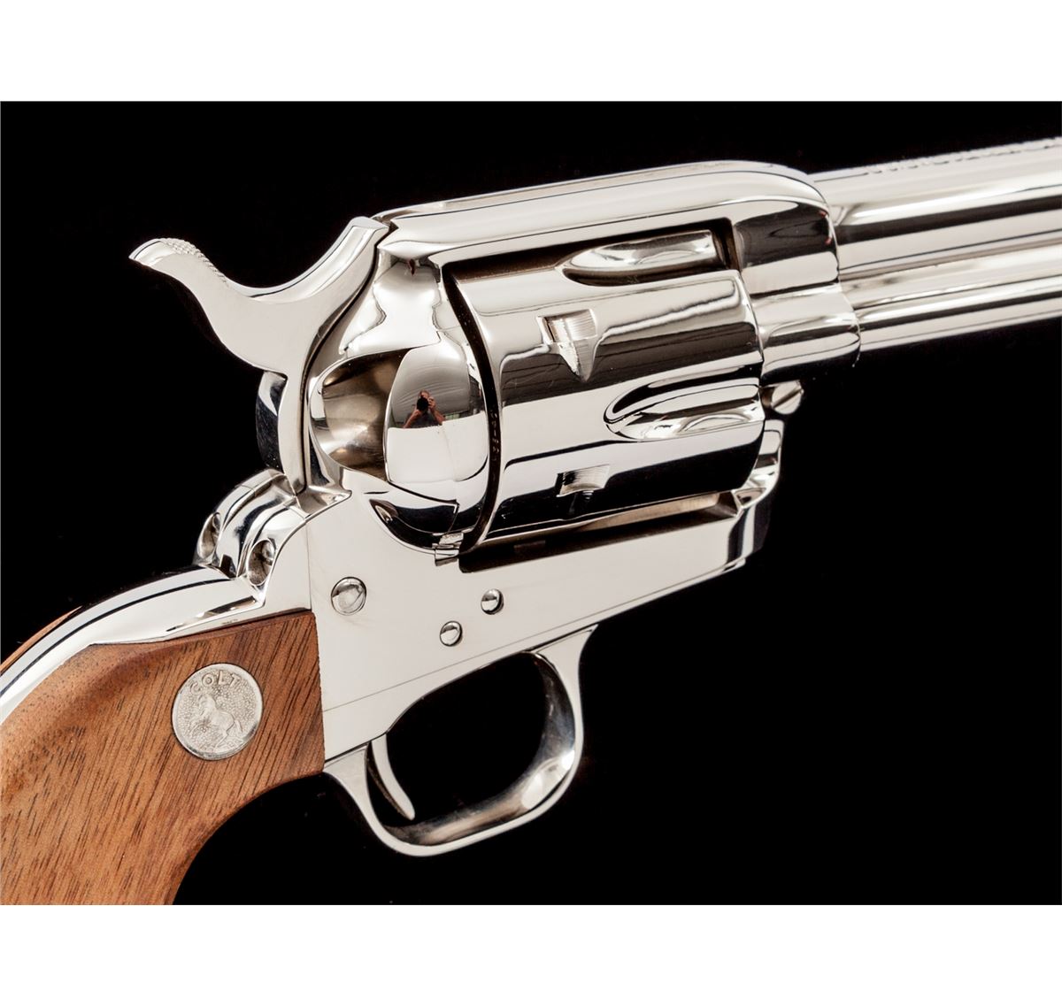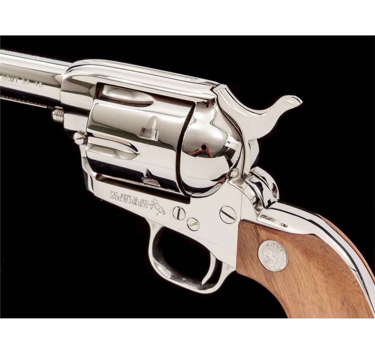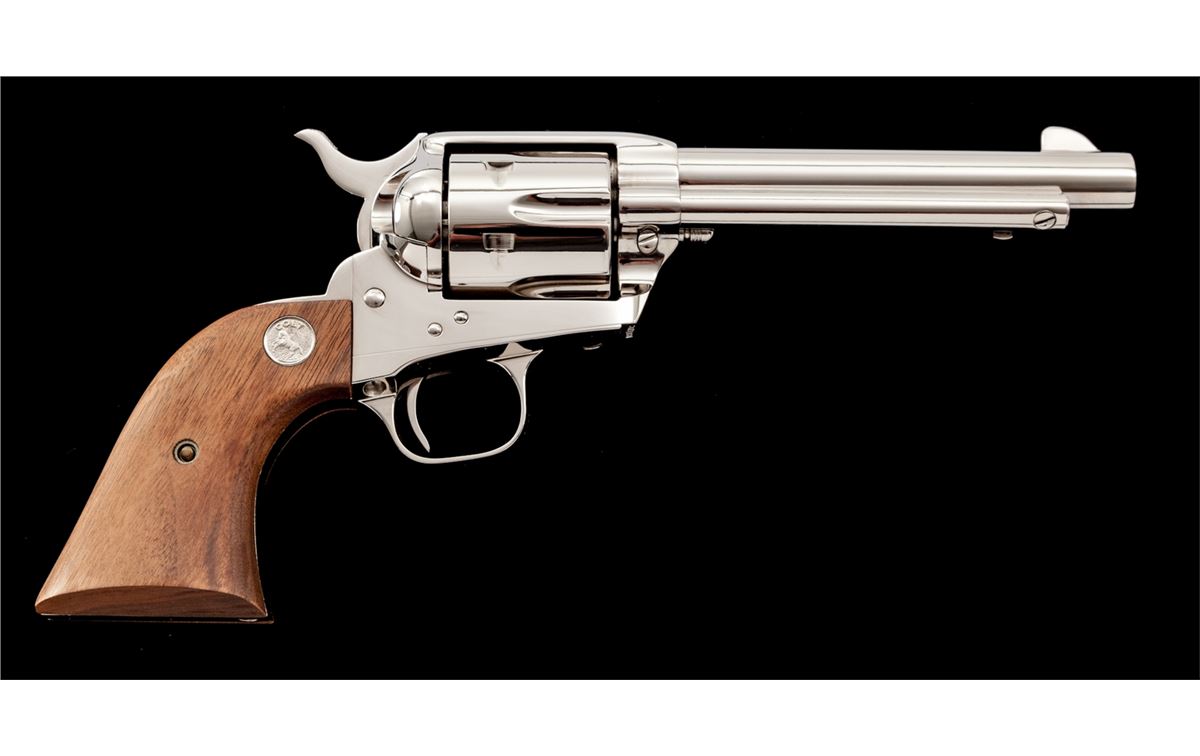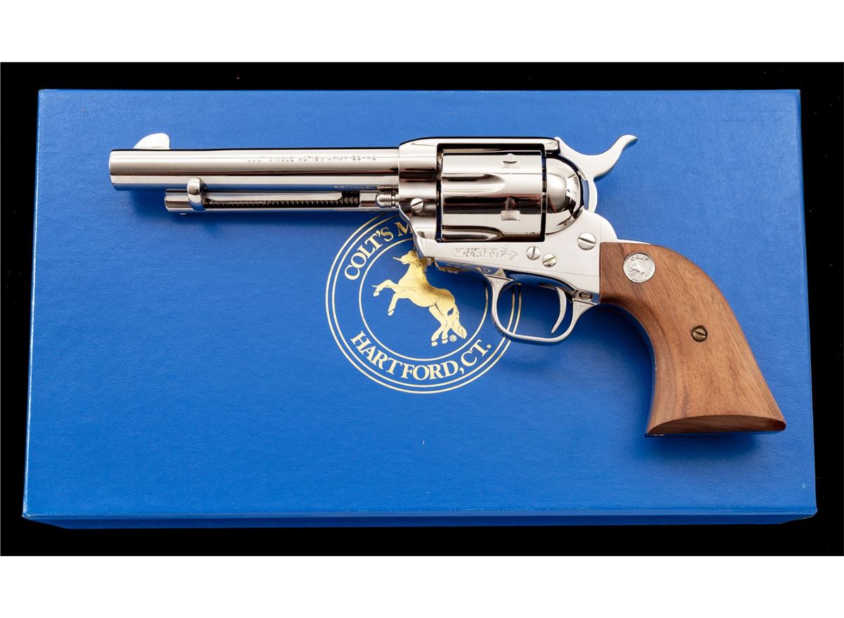 Colt Late 3rd Generation Single Action Army Revolver, #S017108A, .38-40 cal., 5-1/2'' barrel, nickel finish, smooth two-piece walnut grips with medallions, in original box with instructions. Condition is excellent, appearing as new and unfired. Blue box is excellent, as is its slipcover. Est.: $1,000-$1,500. (C&R)