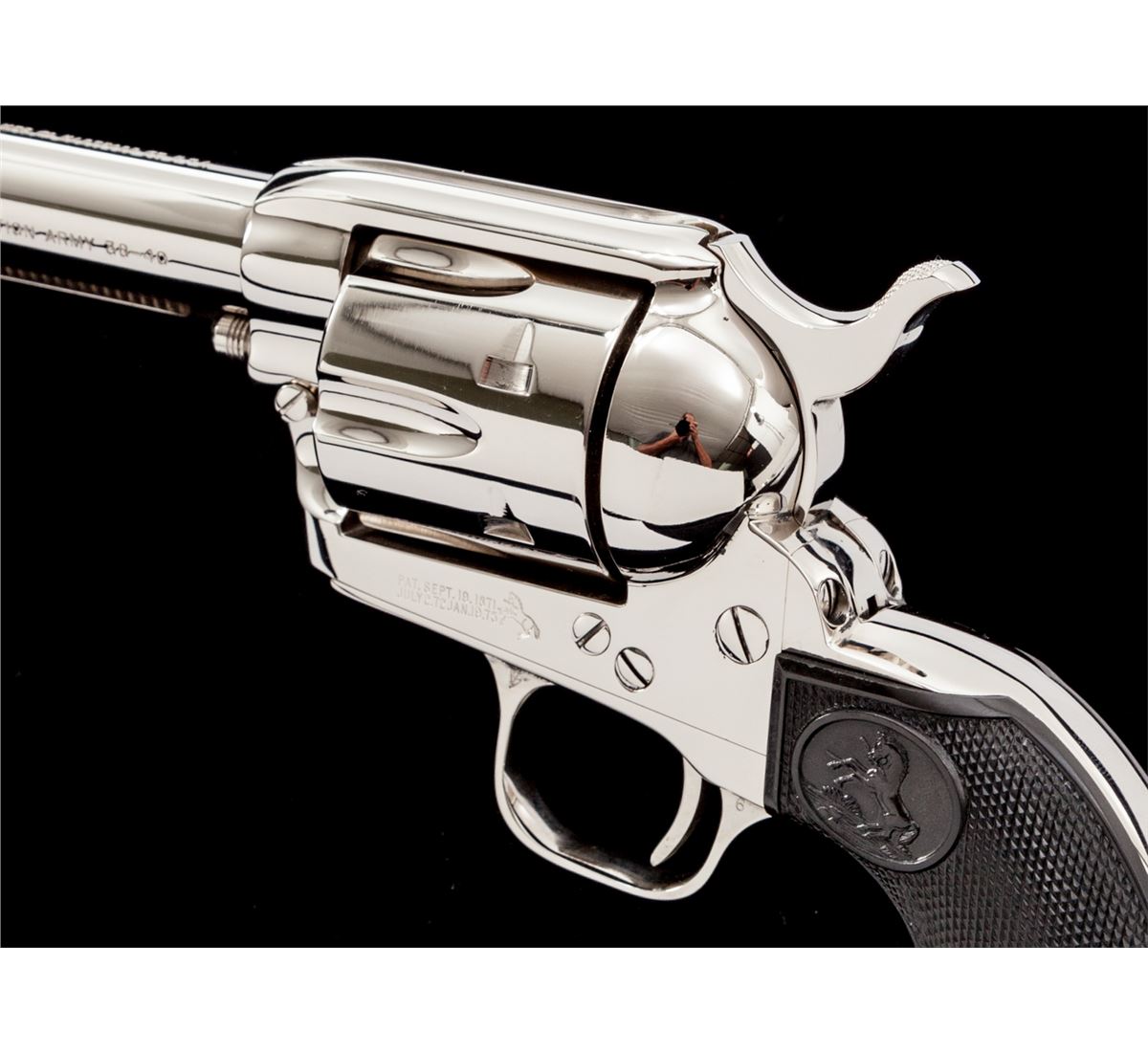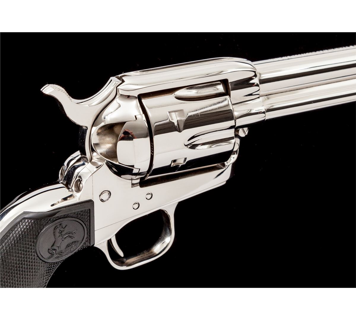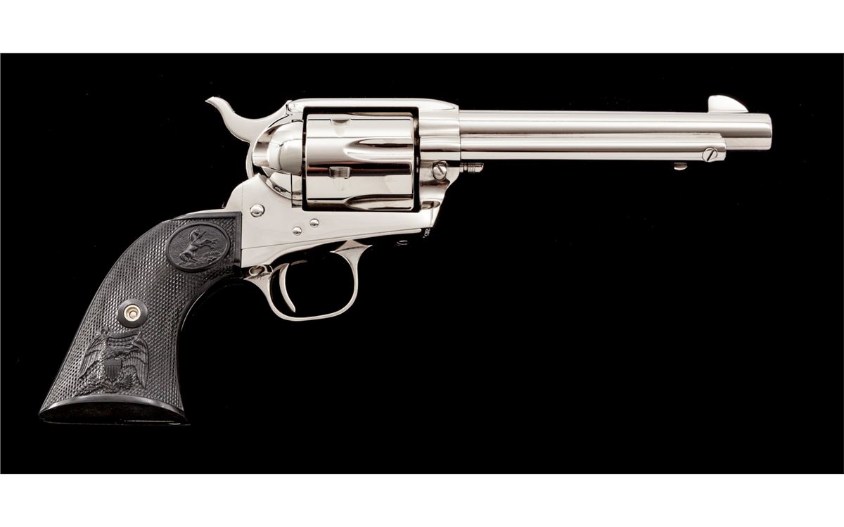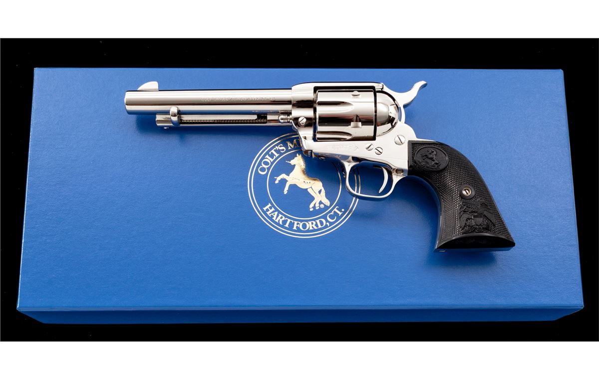 Colt Late 3rd Generation Single Action Army Revolver, #S13726A, .38-40 cal., 5-1/2'' barrel, nickel finish, factory black checkered American eagle plastic grips, in original box with instructions. Condition is excellent, appearing as new and unfired. Blue box is excellent, as is its slipcover. Est.: $1,000-$1,500. (C&R)