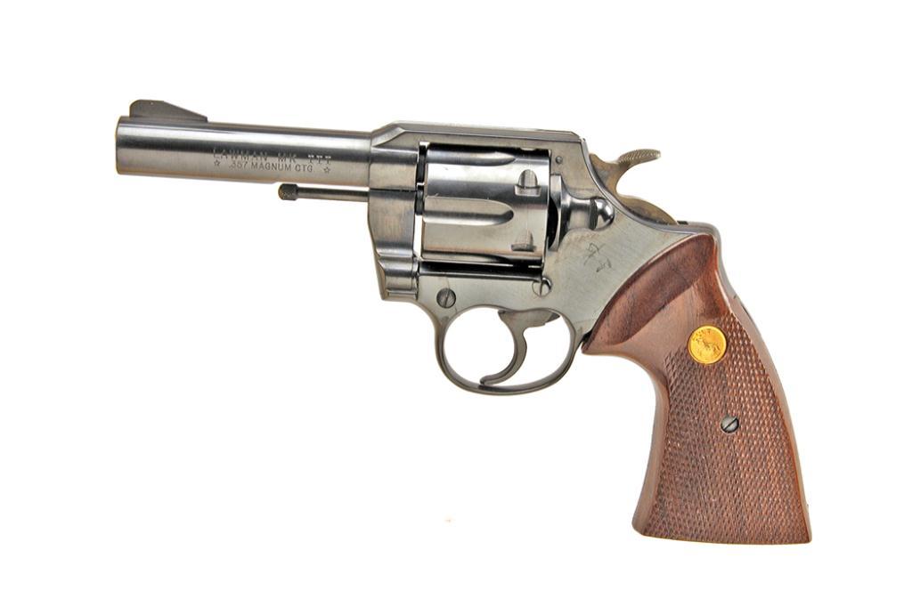 Colt Lawman Mark III Cal .357mag SN:L27858 DA 6 shot heavy barrel revolver. Blued finish, wood checkered target grips, 4" heavy barrel, fixed sights, good bore and action.