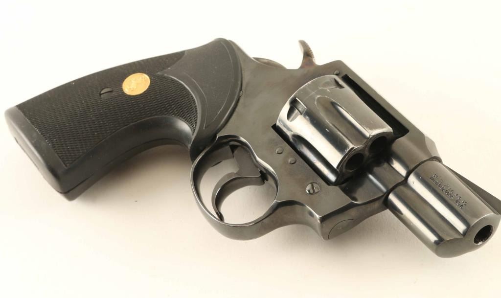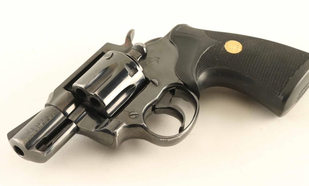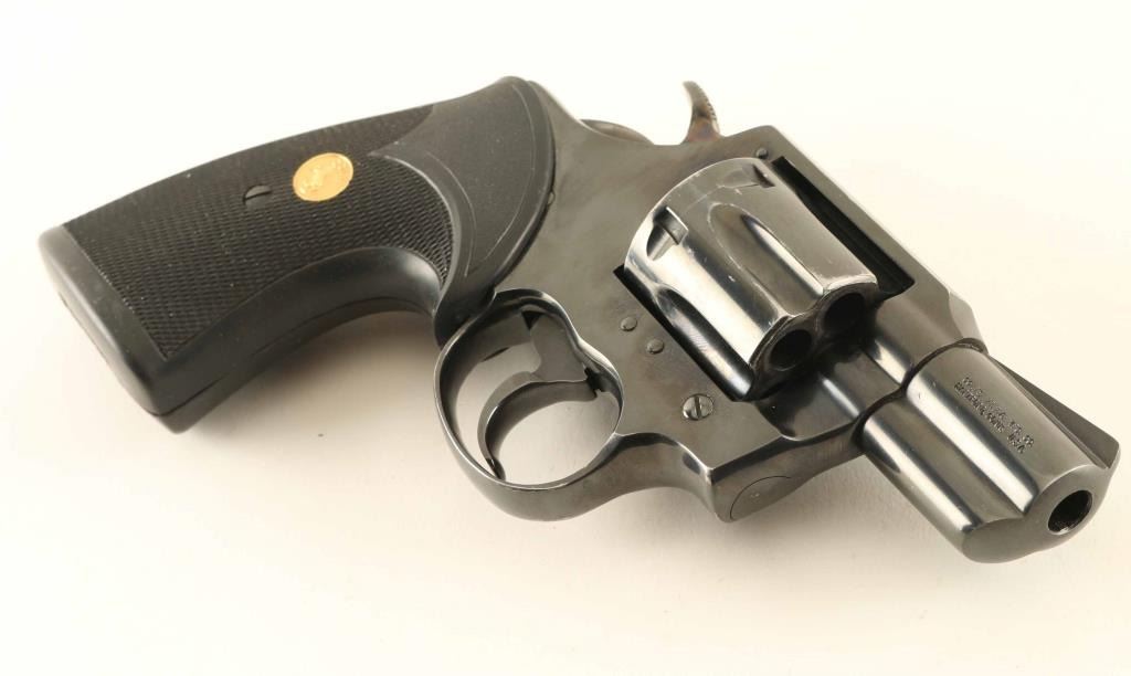 Revolver, double-action. 6-rd capacity. Blued metal finish, with case-hardened hammer. Black, checkered , pachmayr rubber grips, with Colt medallions. produced 1969-1983. 2" barrel, with fixed iron sights. bore, and cylinder chambers appear excellent/bright, but a little dirty. Action is crisp/tight. Blued finish is about 90%, with wear/loss to the edges. Some minor scratches present. come id the original Colt cardboard "Wood grain" box, with manual. NRA condition-Very good. Modern firearm.