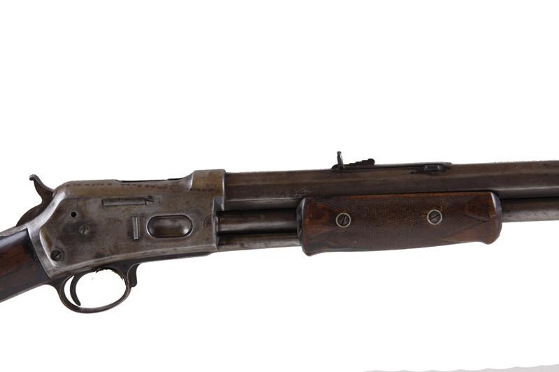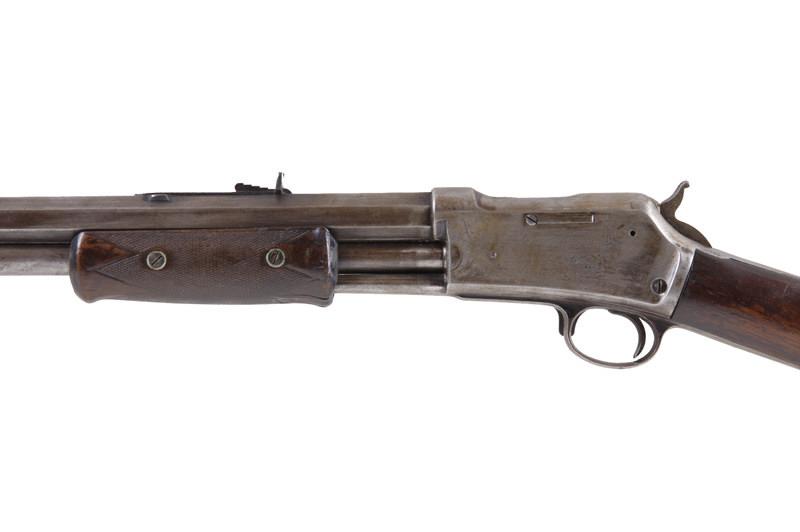 Colt Lightening Cal .38-40 SN:732 Very early Colt pump action rifle in .38-40 Win chambering with exposed hammer. Blued finish, smooth wood straight grip stock and checkered pump handle, 25" octagonal barrel with full length magazine and buckhorn sight,Very early Colt pump action rifle in .38-40 Win chambering with exposed hammer. Blued finish, smooth wood straight grip stock and checkered pump handle, 25" octagonal barrel with full length magazine and buckhorn sight, safety in the trigger guard, good bore and action. Condition: Good but well used. Finish mostly faded to grey, pump handle has small cracks, stock has small crack at the receiver, but both are useable.