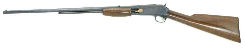 pump action rifle standard 24" octagon barrel, blue finish, straight grain walnut stocks with original checkered butt plate intact. Remains very good as refinished condition, light handling and storage scratches to barrel and receiver, crisp edges and sharp markings, original front and rear sights still present. Good smooth action, dark frosty bore. Mfg'd 1897, NO FFL required.