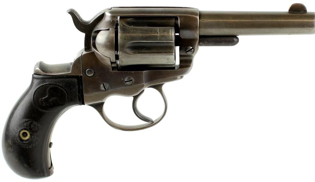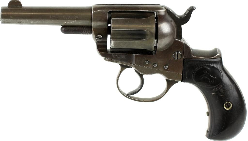Colt Lightning .38 cal. SN 704XX, revolver with 3 1/2" barrel, blue finish and hard rubber checkered grips. Shows gray brown overall patina, all matching visible serial numbers, good functioning action with descent bore. Mfg'd 1888, Antique. Est. 700-900