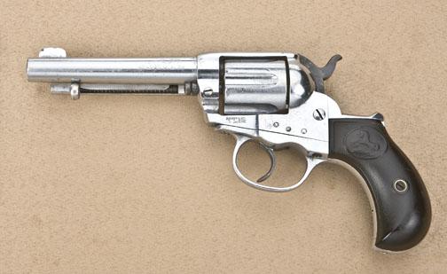 Colt Lightning .38 caliber revolver, 4-1/2” barrel, renickel finish, hard-rubber grips, late production, post 98, serial #163590. The pistol shows 90-95% of an old chrome nickel finish, the front sight has been slimmed down half way. All matching visible serial numbers and mostly visible markings. The action works well, the bore is surprisingly good. Est: $250 - $500