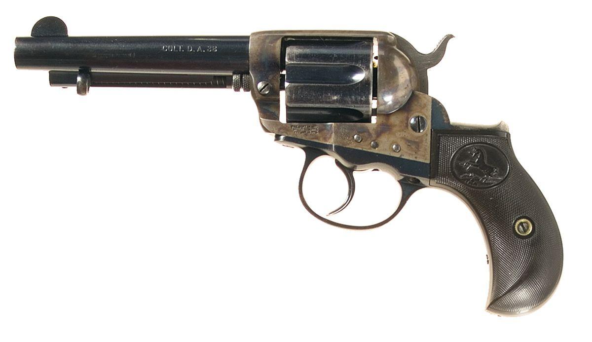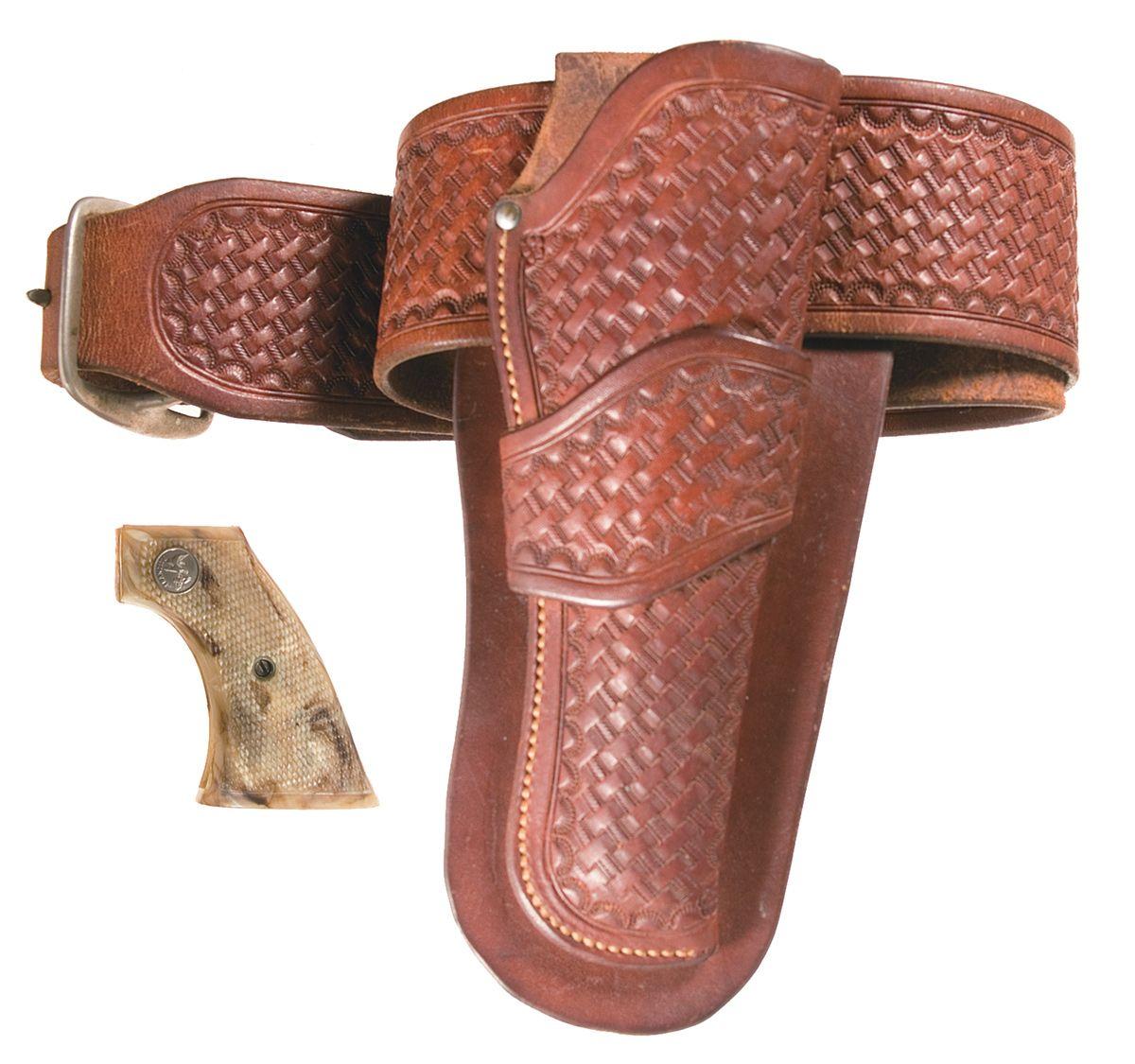 Manufactured in 1895 with standard markings and features. Complete with a H. H. Heiser brown leather basket weave holster and belt and a pair of Franzite grips. The holster is excellent. The additional grips are near new.