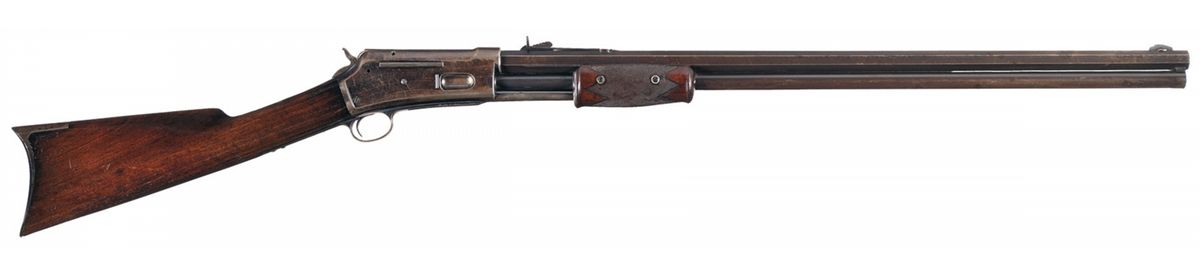 Also known as the "Express" rifle, this rifle was manufactured in 1888, the second year of production for the Large Frame Lightning. Colt only manufactured approximately 6,496 of this large frame variation. The top barrel flat is marked with the two line address/patent dates, the left rear flat is marked "38-56-255" and the Rampant Colt is marked on the left side of the receiver. The serial number is marked on the lower tang. Blade front and adjustable rear sporting sights, blue finish with casehardened hammer and buttplate, and mounted with a checkered walnut forearm and smooth straight grip stock with a crescent buttplate.