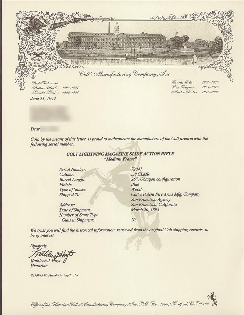 Colt Lightning Model Medium Frame Slide Action Rifle with Factory Letter