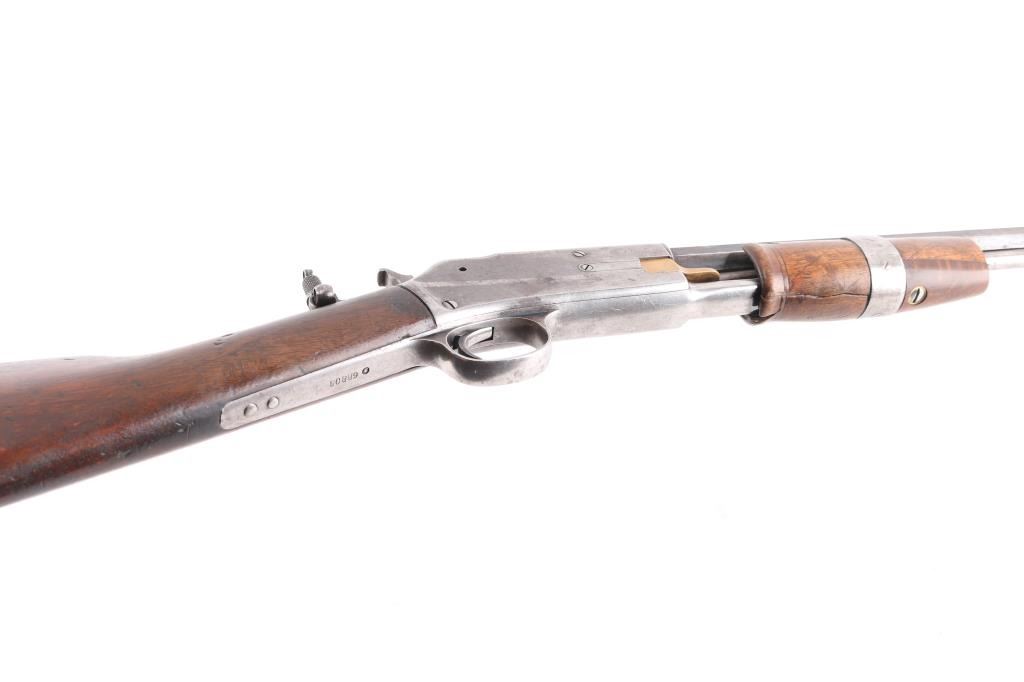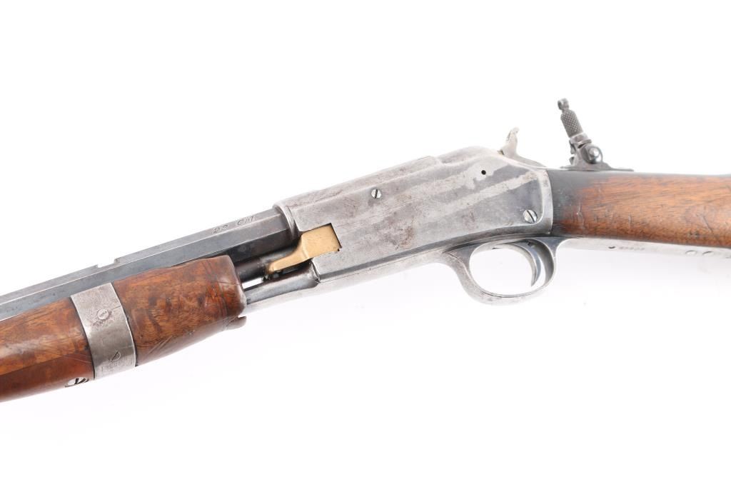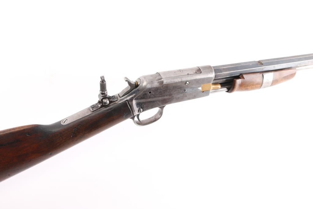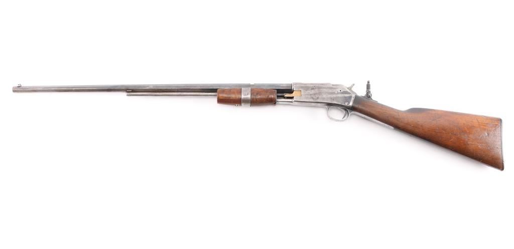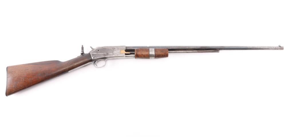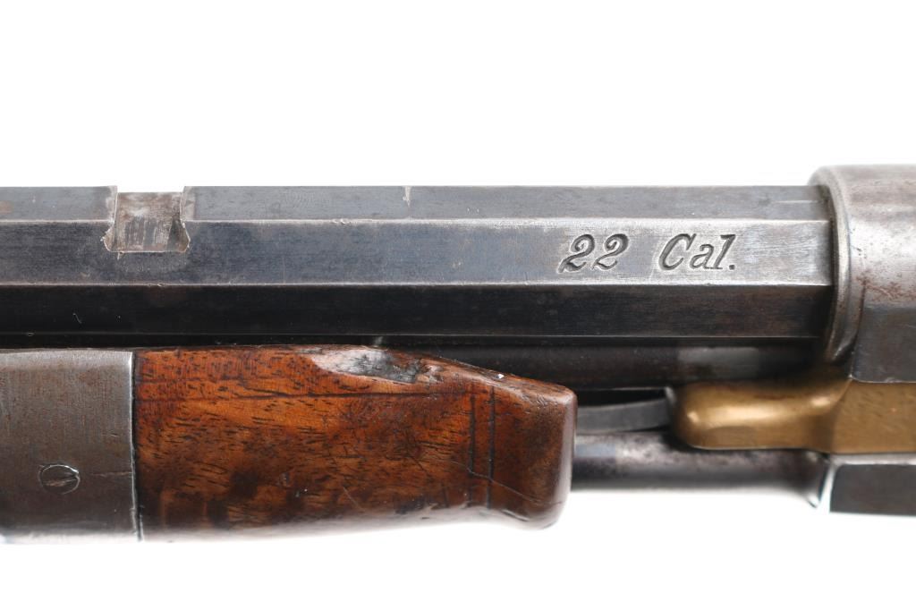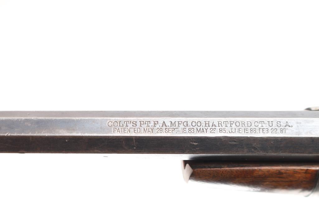 Slide-action. Produced 1884-1904. Small frame. (Second model Colt Lighting) The first rimfire rifle made by Colt. This rifle was manufactured in 1902. Blued finish, case-hardened hammer, and walnut stock. 24" octagonal barrel. Dovetailed white bead front sight, missing rear sight. Walnut stock with checkered black hard rubber factory buttplate, with Rampant Colt. Brass block swing out loading gate, Colt markings and patent date on barrel are clear/crisp, 'Rampant Colt' on left receiver is a little feint. Peep sight installed on tang. Tube magazine. Wood buttstock is good/sound, with numerous dings/dents, nothing serious. Fore grip has a crack on the underside, a chip out of the right rear, has been repaired with a steel band, looks period done with a lot of wear. Metal finish has mostly faded to a dull gray/brown patina, with about 50% dull blue on the barrel. Metal has numerous dings/rubs, but again , nothing serious. Some minor scattered pin-prick pitting. Action is smooth. Bore appears rough, but the rifling is present. Rifle has been handled roughly, maybe a gallery gun at one time.