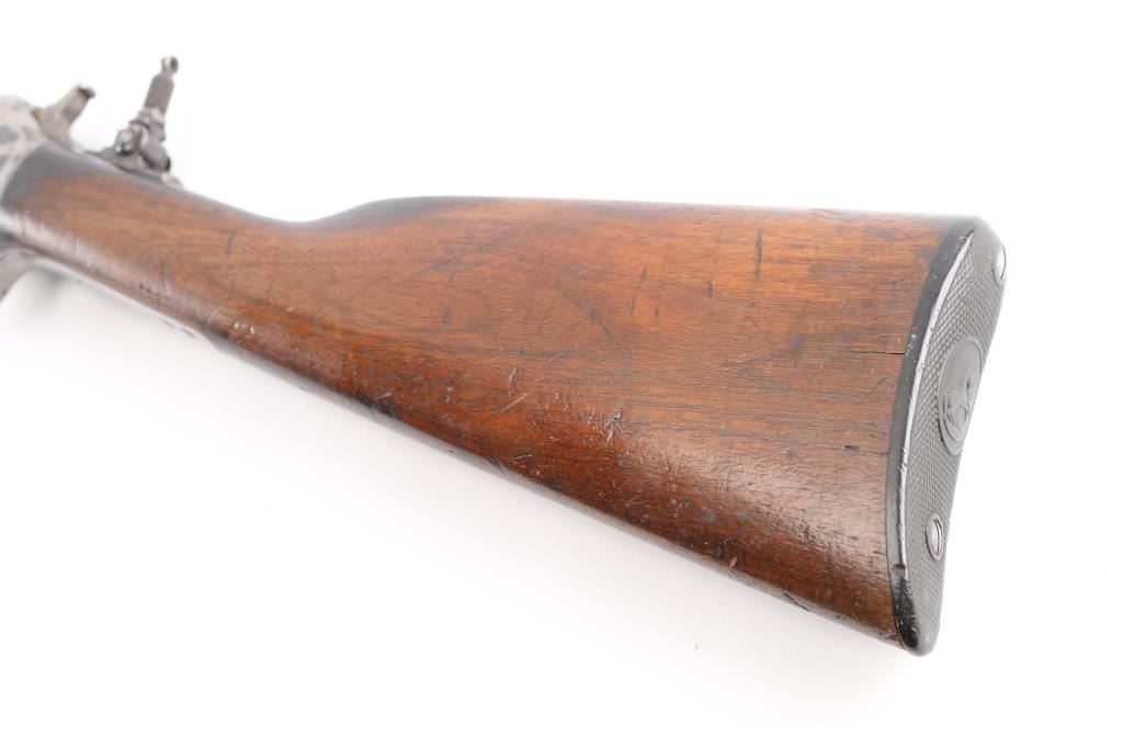 GOOD: Some minor replacement parts; metal smoothly rusted or lightly pitted in places, cleaned or re-blued; principal letters, numerals and design on metal legible; wood refinished, scratched bruised or minor cracks repaired; in good working order.