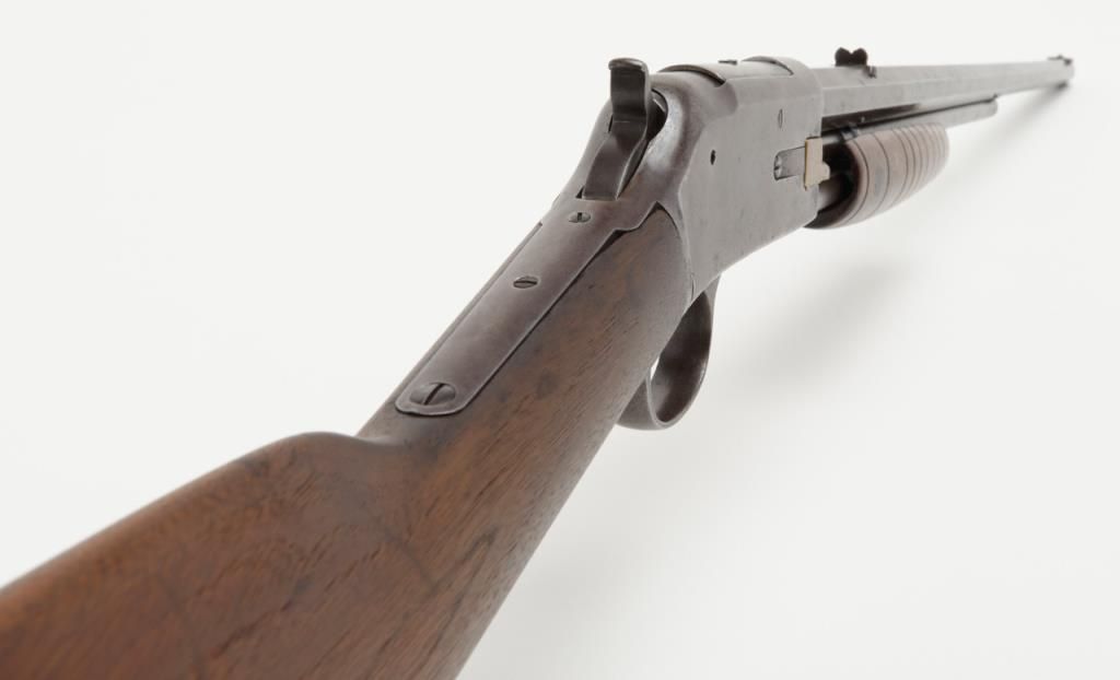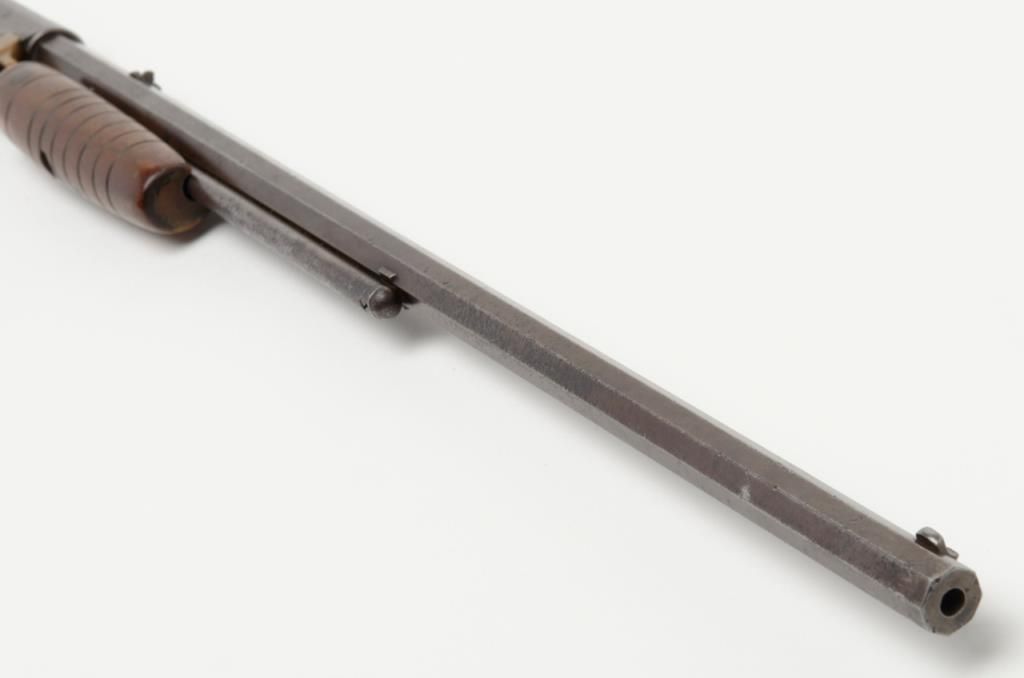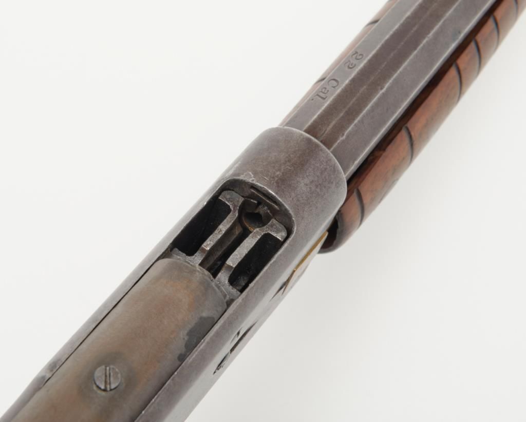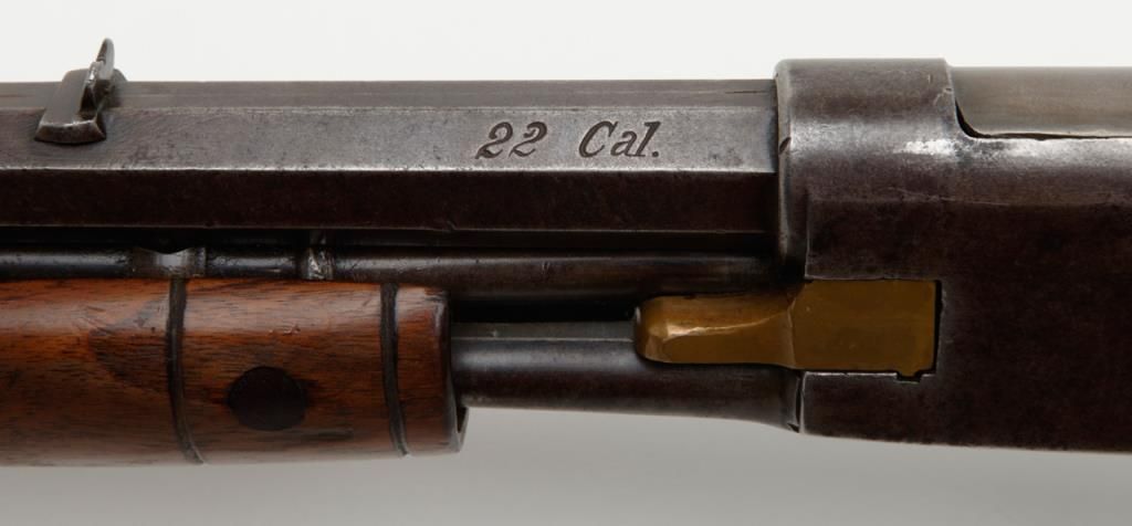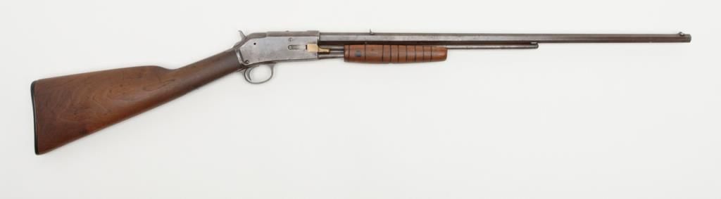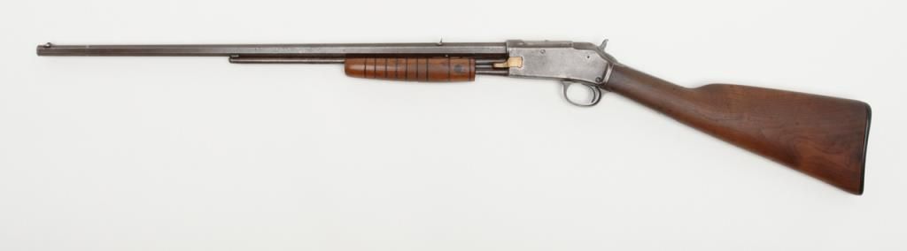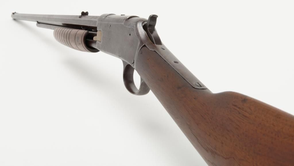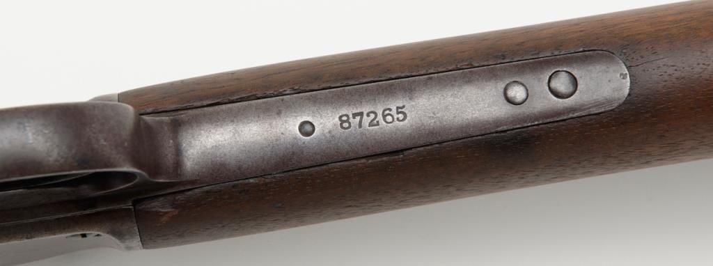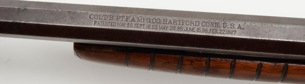 Colt Lightning Small Frame slide-action rifle, cal. .22 Long or Short, Serial #87265. The rifle is in overall fair condition with a 24" blued, octagon barrel. The barrel and action show slight amounts of blue in the protected areas with theremainder of the finish having gone to plum patina. The fore end is a replacement while the smooth wood butt stock is in good condition with two repairs at the heel. The hard rubber butt plate is Colt marked. The bore is good and mayclean. (C+R/PPT). Est.: $350-$700.