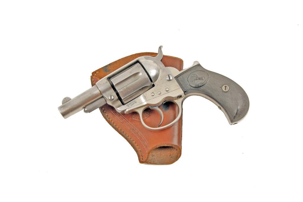 Colt Lightning Storekeeper Cal .38Colt SN:41459, DA 6 shot pocket revolver. Metal finish, black "Birds head" plastic grips, 2 1/2" barrel, fixed sight, good bore and working action. Condition: Metal in fair condition with several pin prick pitting onSN:41459, DA 6 shot pocket revolver. Metal finish, black "Birds head" plastic grips, 2 1/2" barrel, fixed sight, good bore and working action. Condition: Metal in fair condition with several pin prick pitting on sight and frame . Includesnice brown leather holster made by Biffar of Chicago.