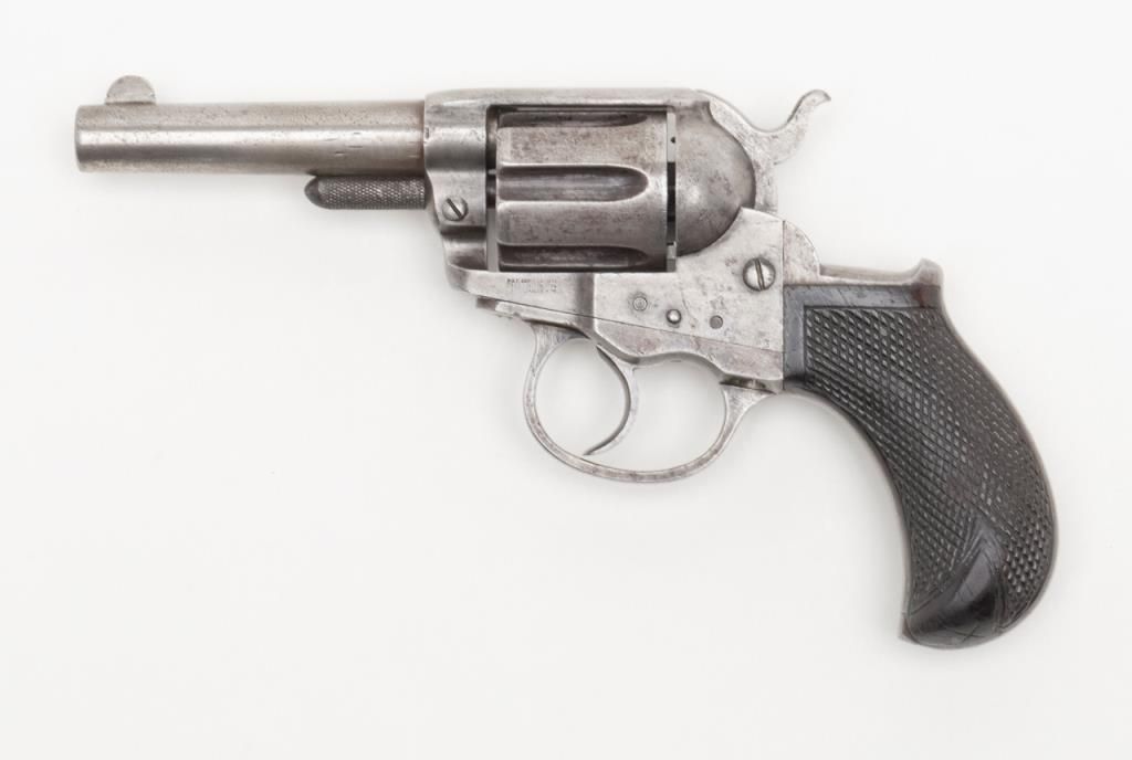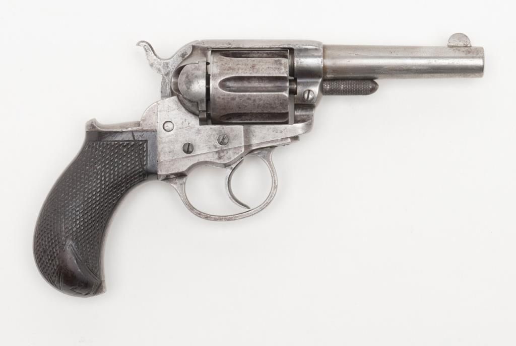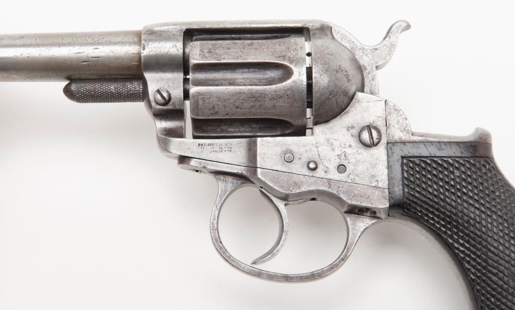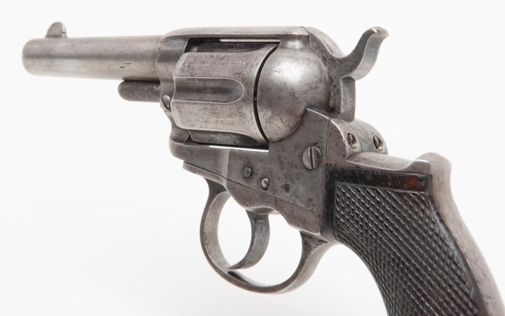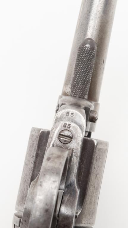 Colt Lightning Storekeeper’s Model 1877 DA revolver, early production series, ejectorless, blue and case hardened finish, .38 cal., 3-1/2” barrel, checkered rosewood one-piece grips, German silver front sight, #85. This gun is in overallgood condition with light to moderate surface pitting, fair bore, action is frozen, grips are overall good with scattered mars and scratches from carry and storage with “x” carved into each side of the bottom of the grips; all matchingvisible numbers as well as 85 on back of cylinder. A rare opportunity to obtain a two-digit Lightning. (Antique). Est.: $1,500-$2,500.