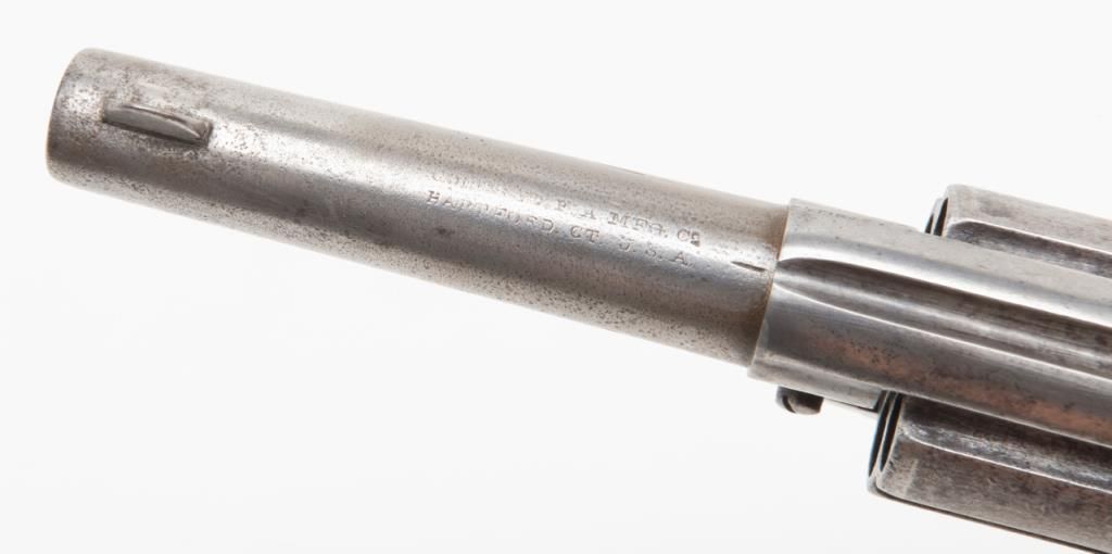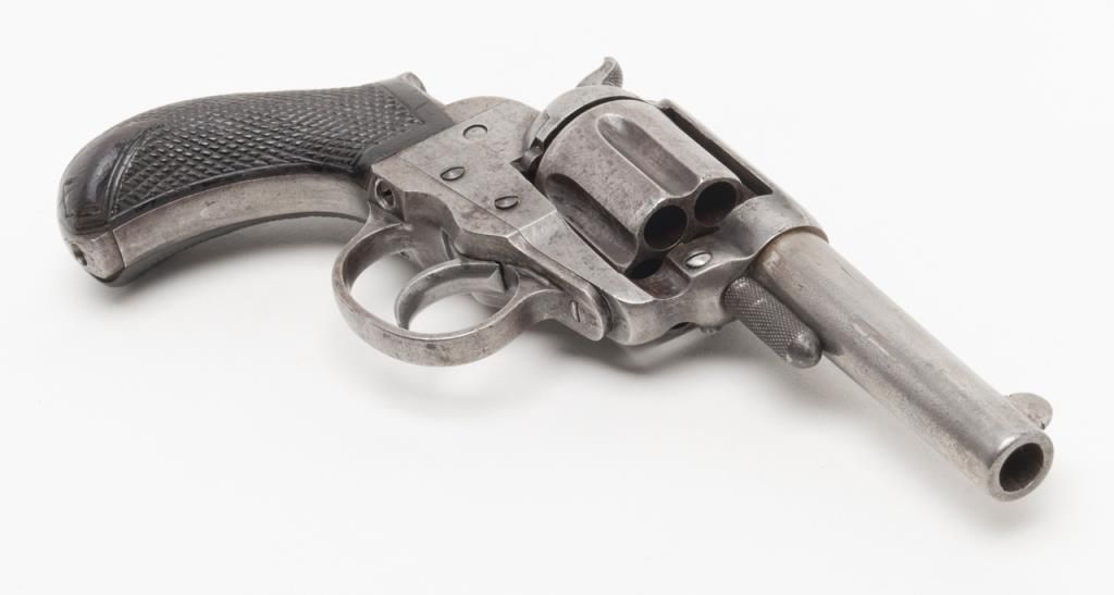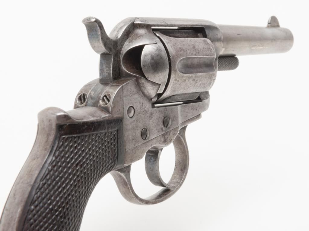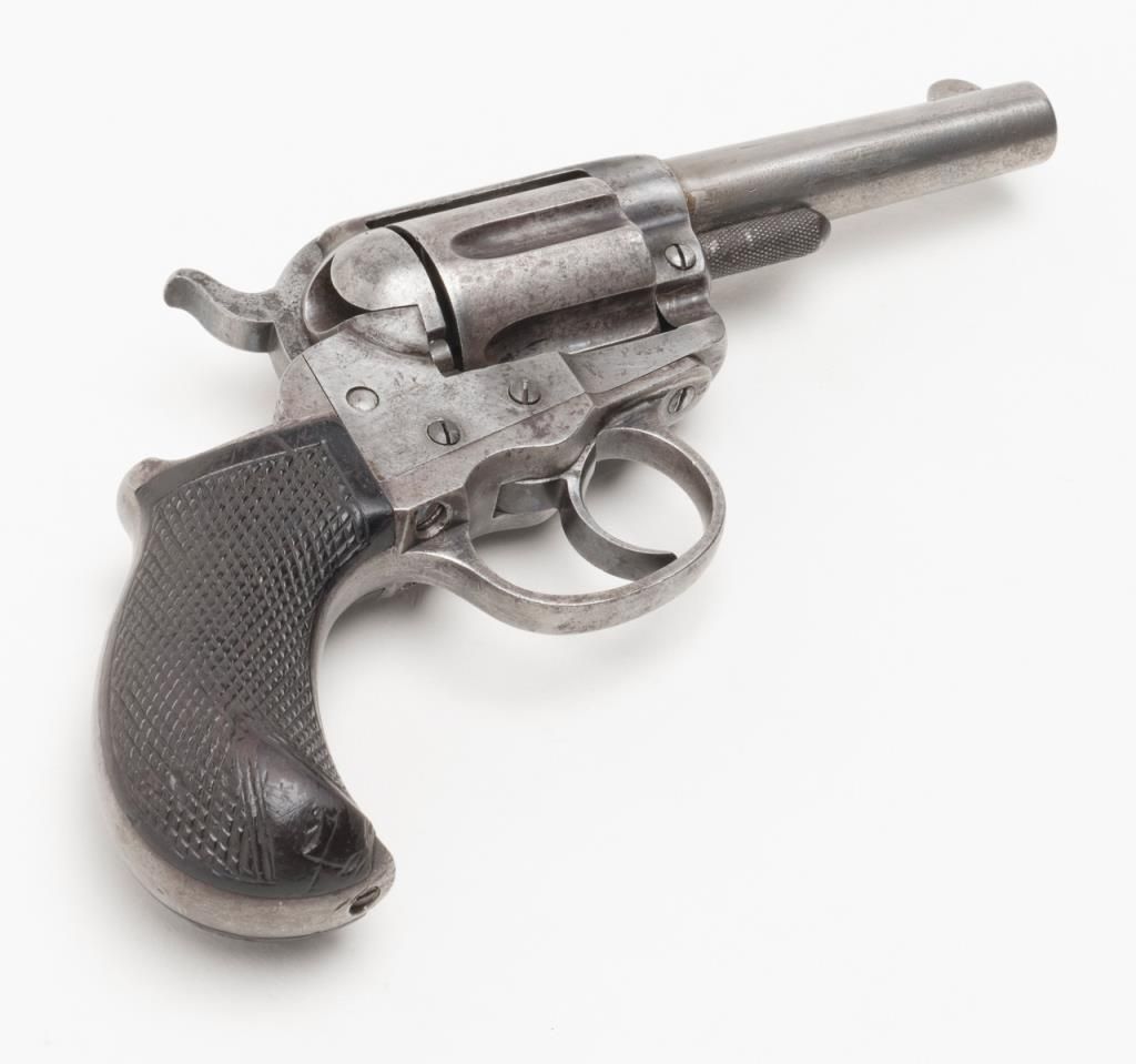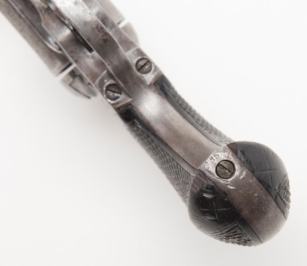 Colt Lightning Storekeeper’s Model 1877 DA revolver, early production series, ejectorless, blue and case hardened finish, .38 cal., 3-1/2” barrel, checkered rosewood one-piece grips, German silver front sight, #85. This gun is in overallgood condition with light to moderate surface pitting, fair bore, action is frozen, grips are overall good with scattered mars and scratches from carry and storage with “x” carved into each side of the bottom of the grips; all matchingvisible numbers as well as 85 on back of cylinder. A rare opportunity to obtain a two-digit Lightning. (Antique). Est.: $1,500-$2,500.