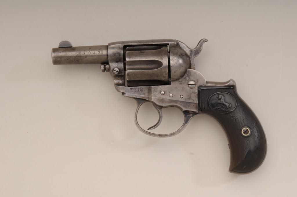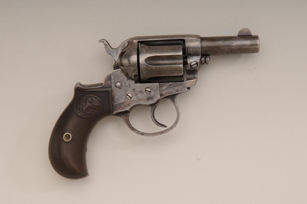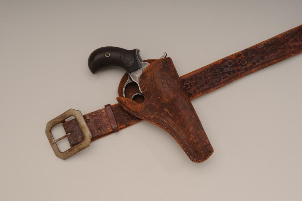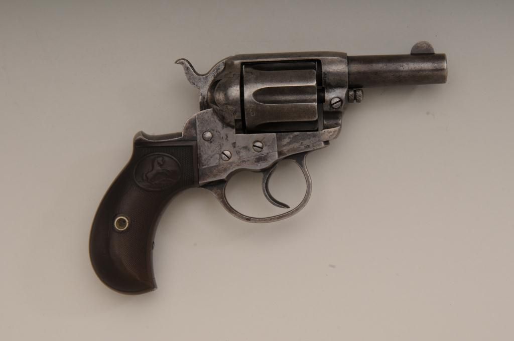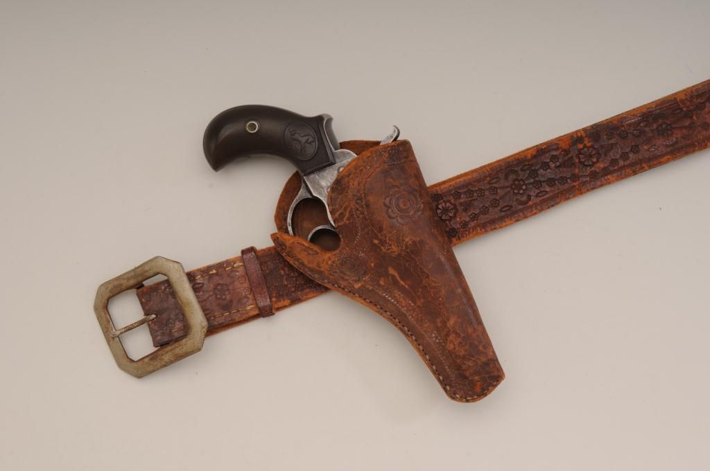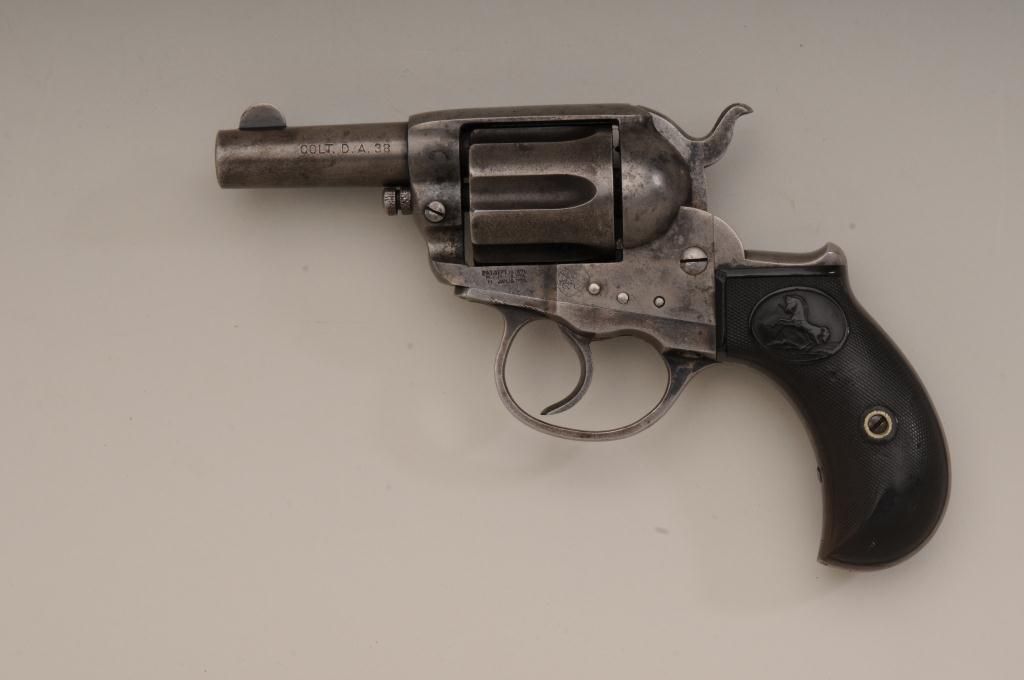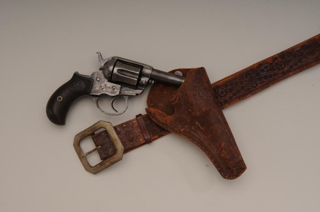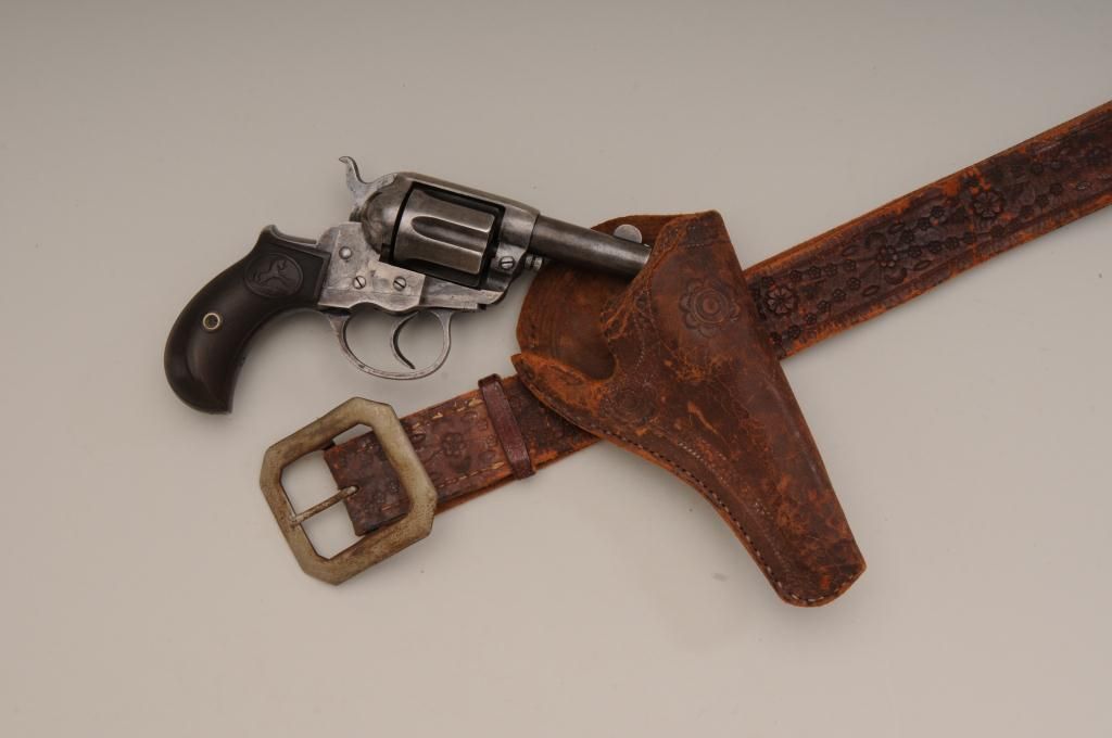 Colt Lightning Storekeepers Model in .38 caliber with factory 2 ½” barrel, traces of blue and case hardened finish, hard rubber grips, serial number 135411. This Lightning retains traces of blue and case hardenedfinish perhaps as much as 10% to 20% mixed with a gray to brown patina finish. There is some scattered light to moderate erosion and pitting. The markings are good and the two line centered barrel address is very clear.The grips show even wear and the action is working at time of cataloging. The interior is good and all matching visible serial numbers with correct cylinder pin. An original to the period catalog holster isincluded with matching floral impressed belt. A classic frontier era rig made at about the turns at of the century 1900 to 1902. Must be registered. Est.: $400-$800