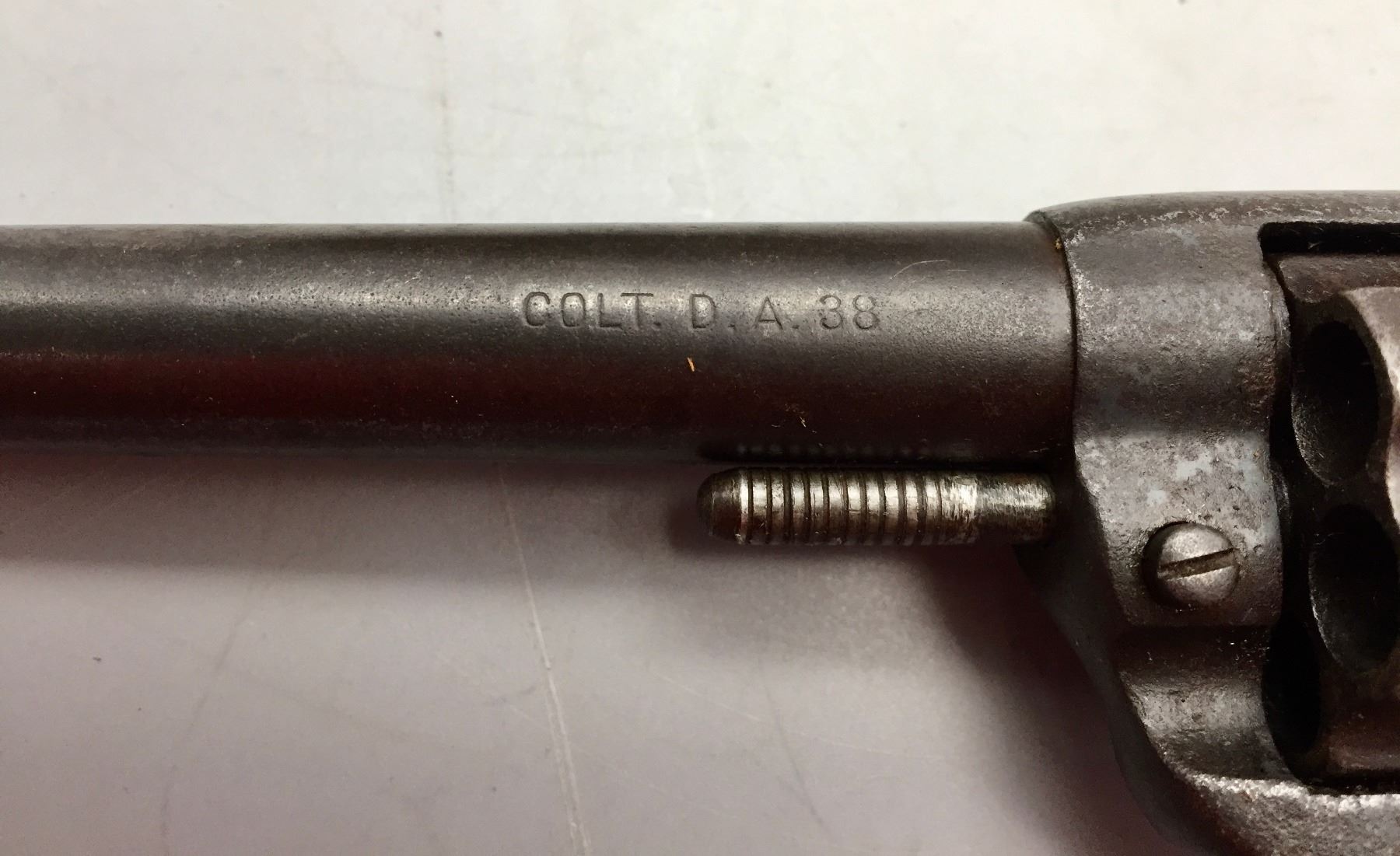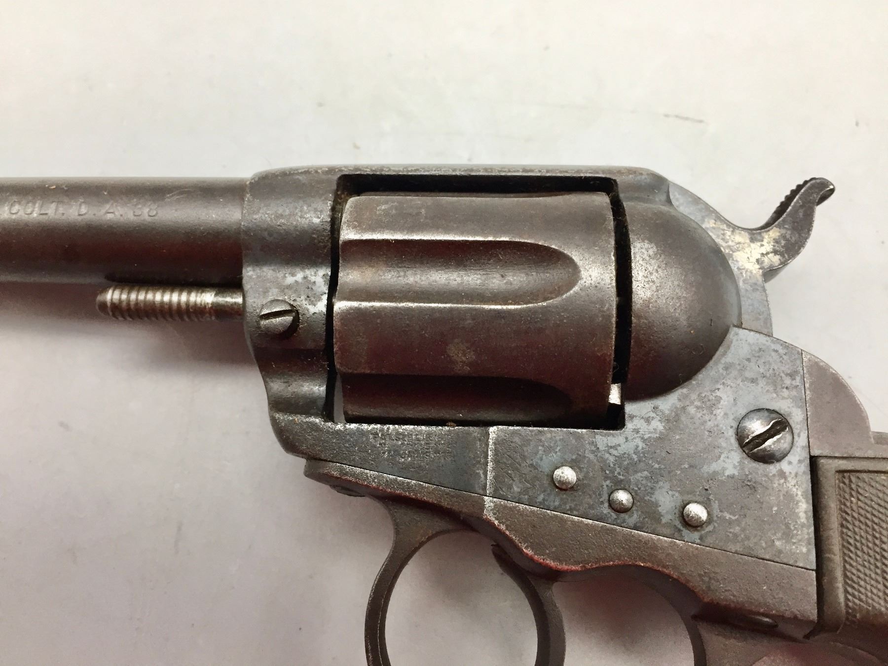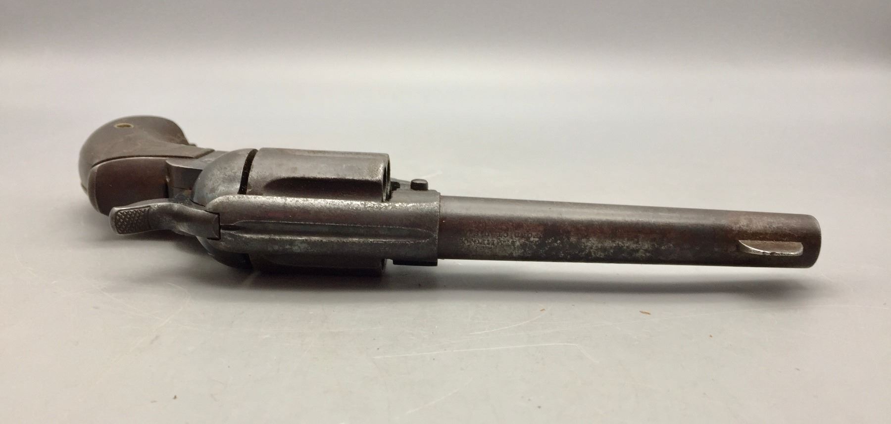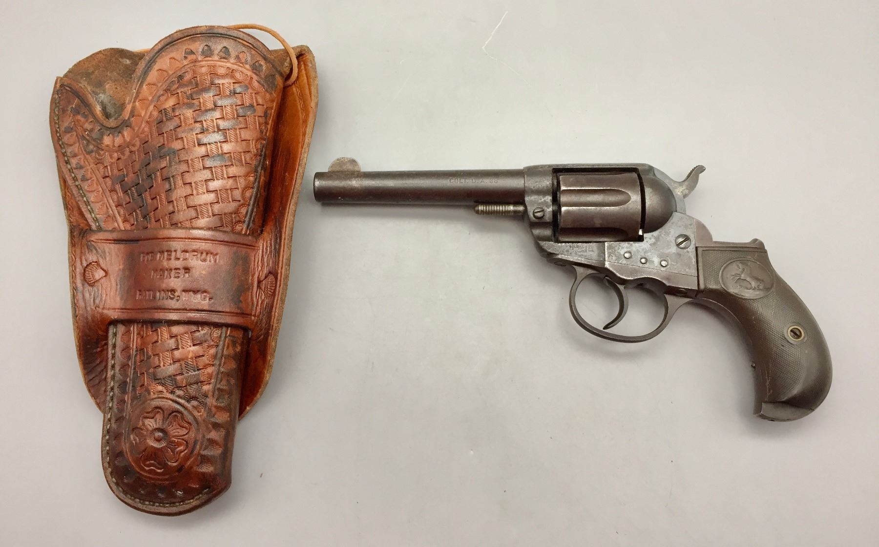 Description: Presented for sale in this lot is a .38 caliber Colt Lightning Pistol with a brown leather holster created by Bob Meldrum. Maker: Colt and Meldrum. Approx. Age: 1898 on on the Colt lighting (#109992). Fairly modern on the holster. Size: Barrel measures 4-1/2” with an overall length of 10-1/2”. Holster measures 5-1/2”w x 9” long. Condition: Good on the holster, normal wear expected. Poor on the pistol, missing the ejector rod. Shows use. Please look closely at the pictures - they are an important part of our description. Shipping: There will be a $10 handling / packaging fee for shipping this lot. The actual cost of postage will be added on top of that. *****ANTIQUE - This firearm DOES NOT requires an FFL Transfer*****