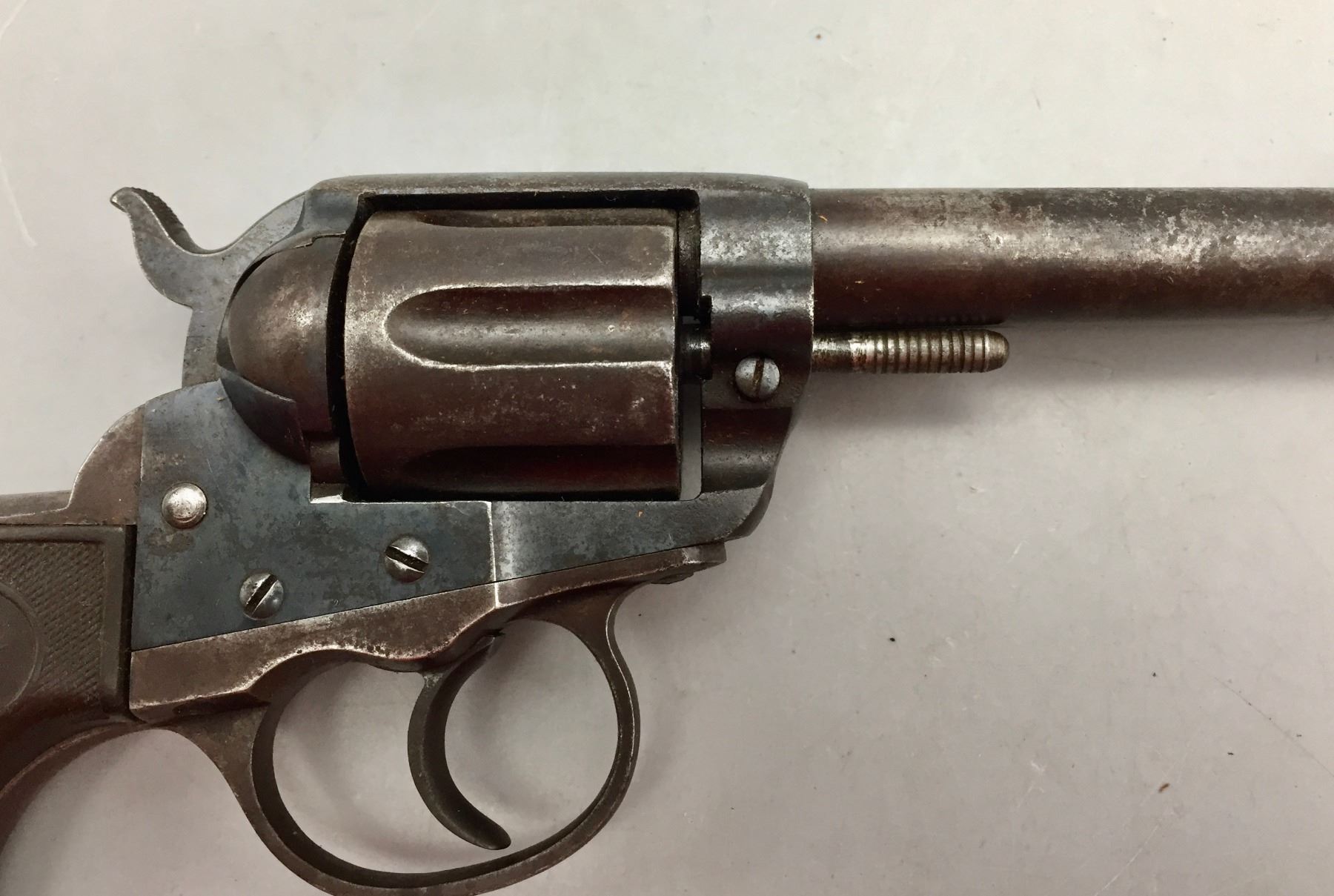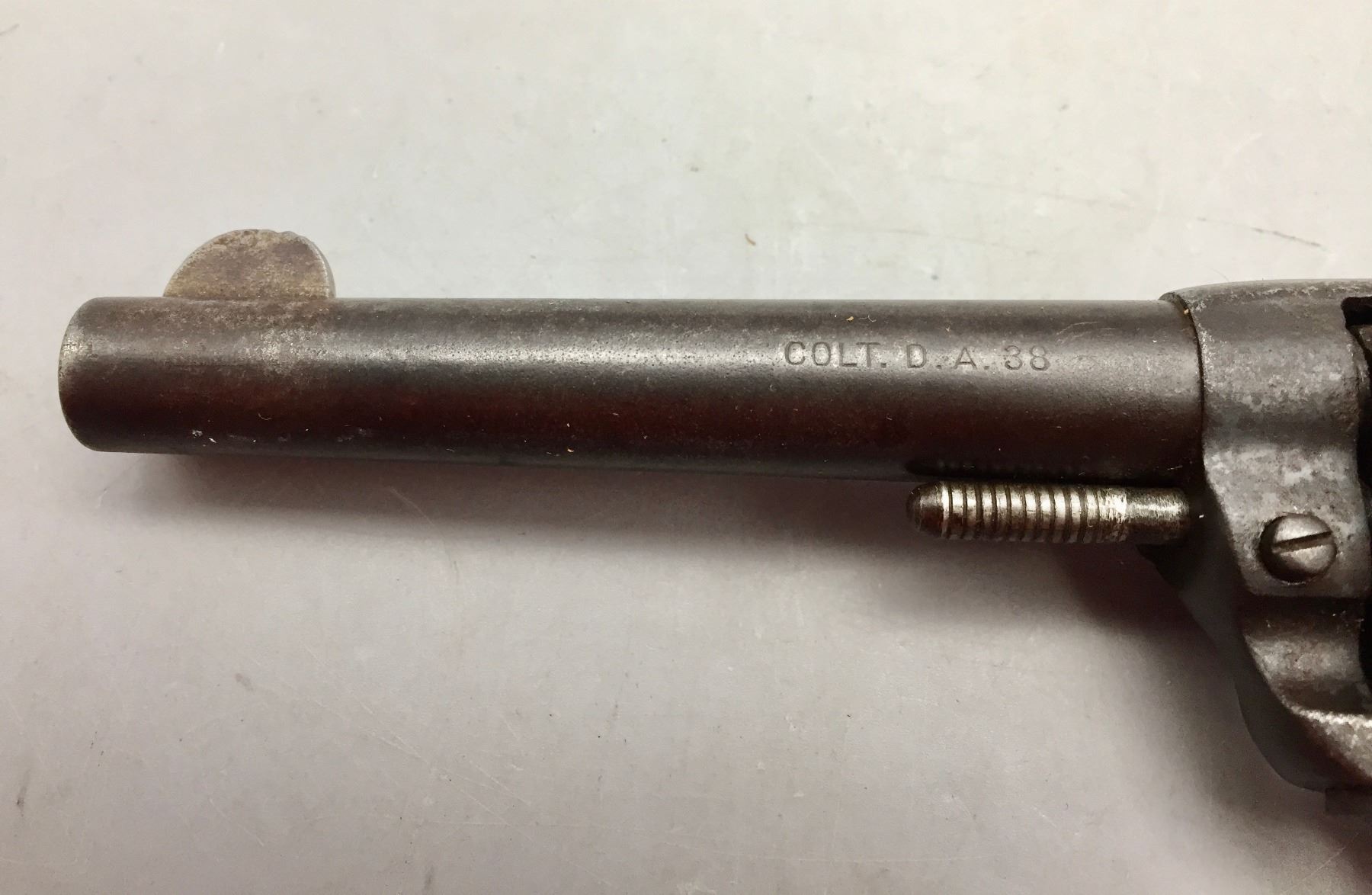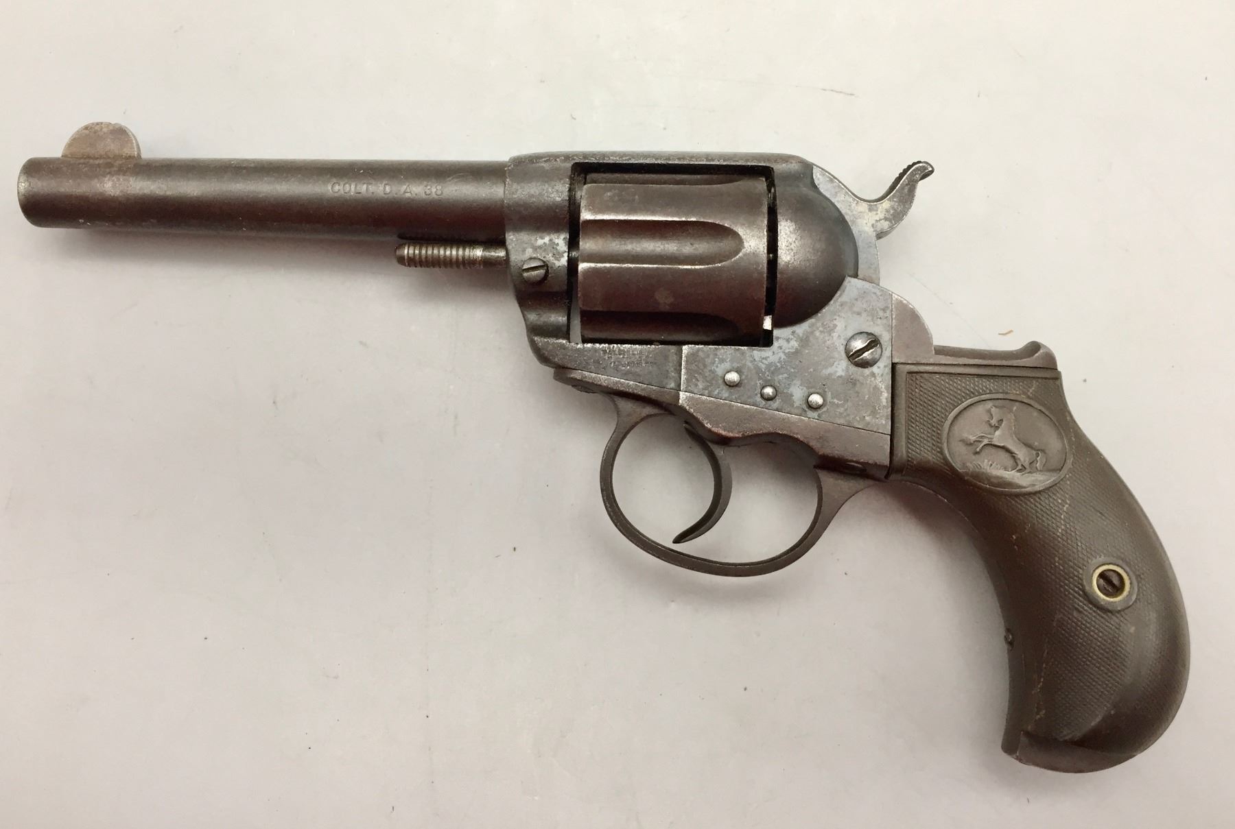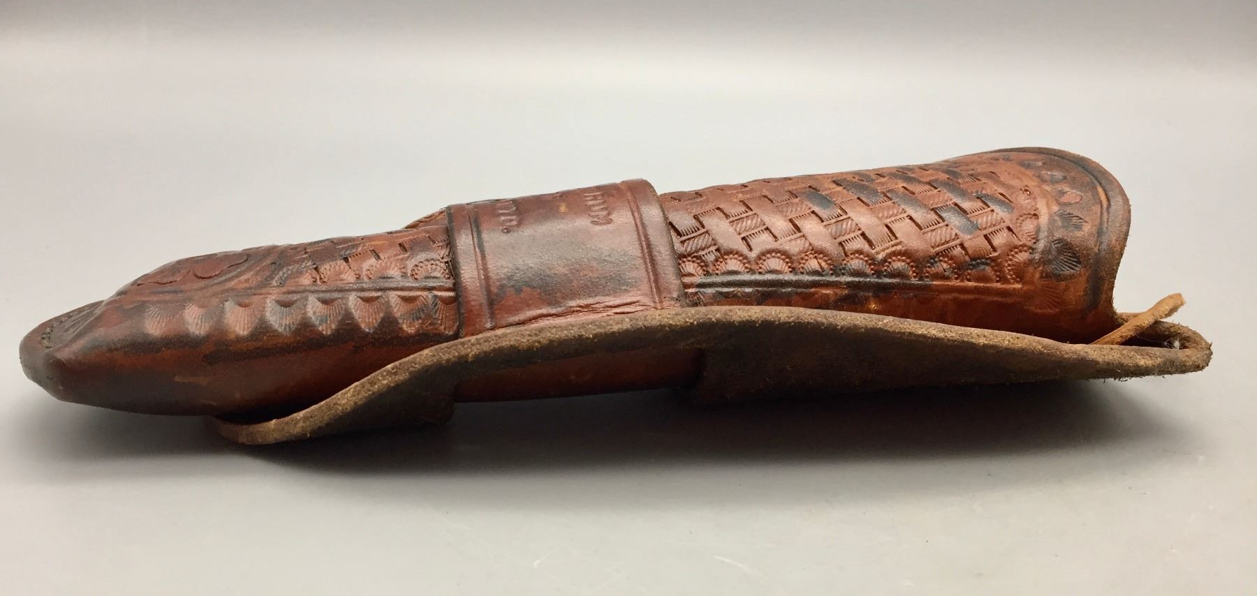 Description: Presented for sale in this lot is a .38 caliber Colt Lightning Pistol with a brown leather holster created by Bob Meldrum. Maker: Colt and Meldrum. Approx. Age: 1898 on on the Colt lighting (#109992). Fairly modern on the holster. Size: Barrel measures 4-1/2” with an overall length of 10-1/2”. Holster measures 5-1/2”w x 9” long. Condition: Good on the holster, normal wear expected. Poor on the pistol, missing the ejector rod. Shows use. Please look closely at the pictures - they are an important part of our description. Shipping: There will be a $10 handling / packaging fee for shipping this lot. The actual cost of postage will be added on top of that. *****ANTIQUE - This firearm DOES NOT requires an FFL Transfer*****
