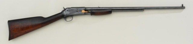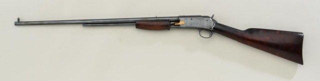 Colt Lightning pump action small frame rifle, .22 cal., 24” octagon barrel, re-blued finish, wood stocks, #64954. This gun is in overall good condition showing the majority of its old re-blue finish, good action andbore, wood is overall good showing some darkening at the top of the butt stock and top of the right side of the fore end as if singed by heat; front sight is a large open globe sight, the type that would be used fortrick shooting, probably for glass ball targets; an interesting Colt rifle that would be interesting to letter with the factory. Est.: $350-$700.