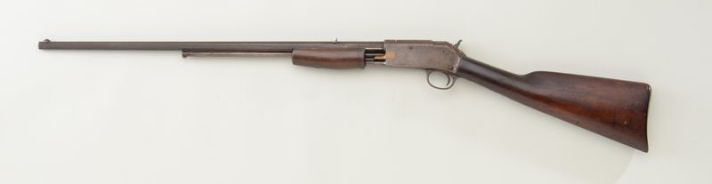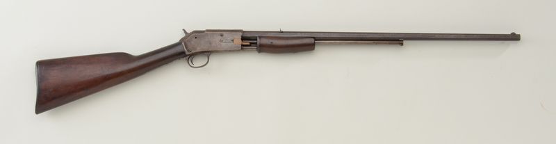 Colt Lightning small frame pump action rifle, .22 cal., 24” octagon barrel, blue finish, wood stocks, #72432. This gun is in overall good condition showing a brown patina on metal surfaces with scattered erosion andsurface spotting from poor storage; fair bore, good action and wood; a little TLC and careful oiling should improve this antique Colt rifle. Est.: $300-$600.