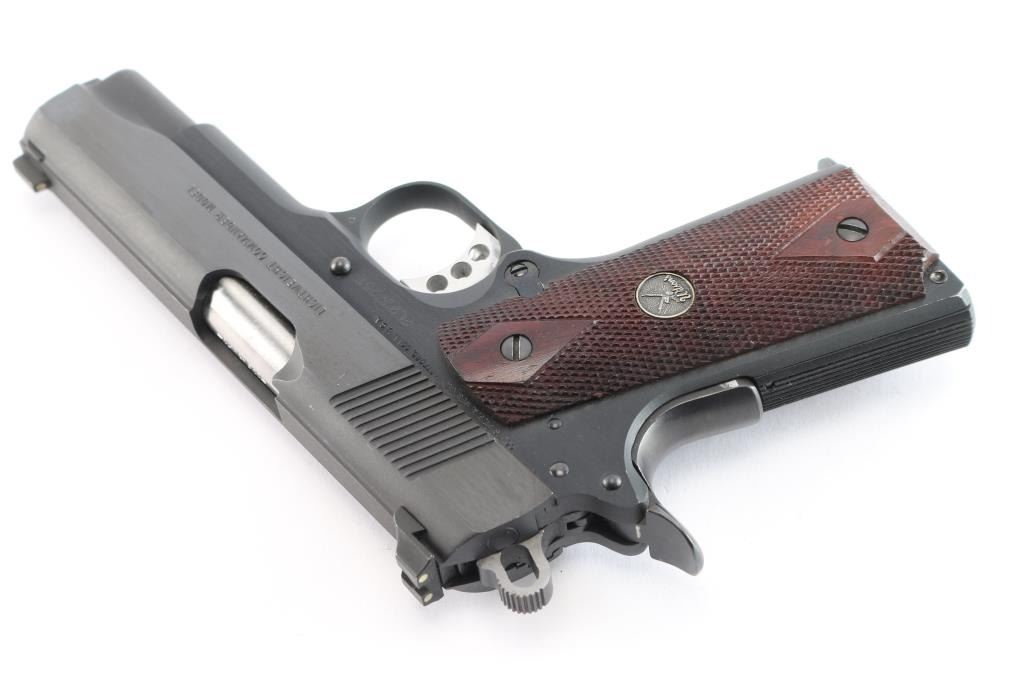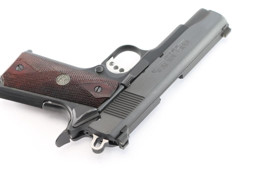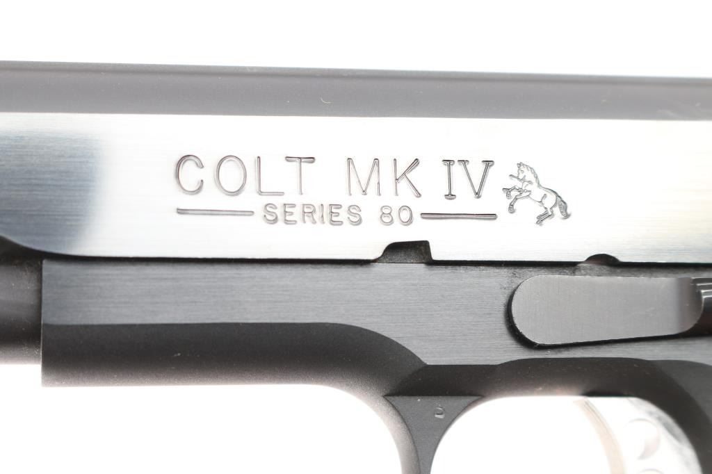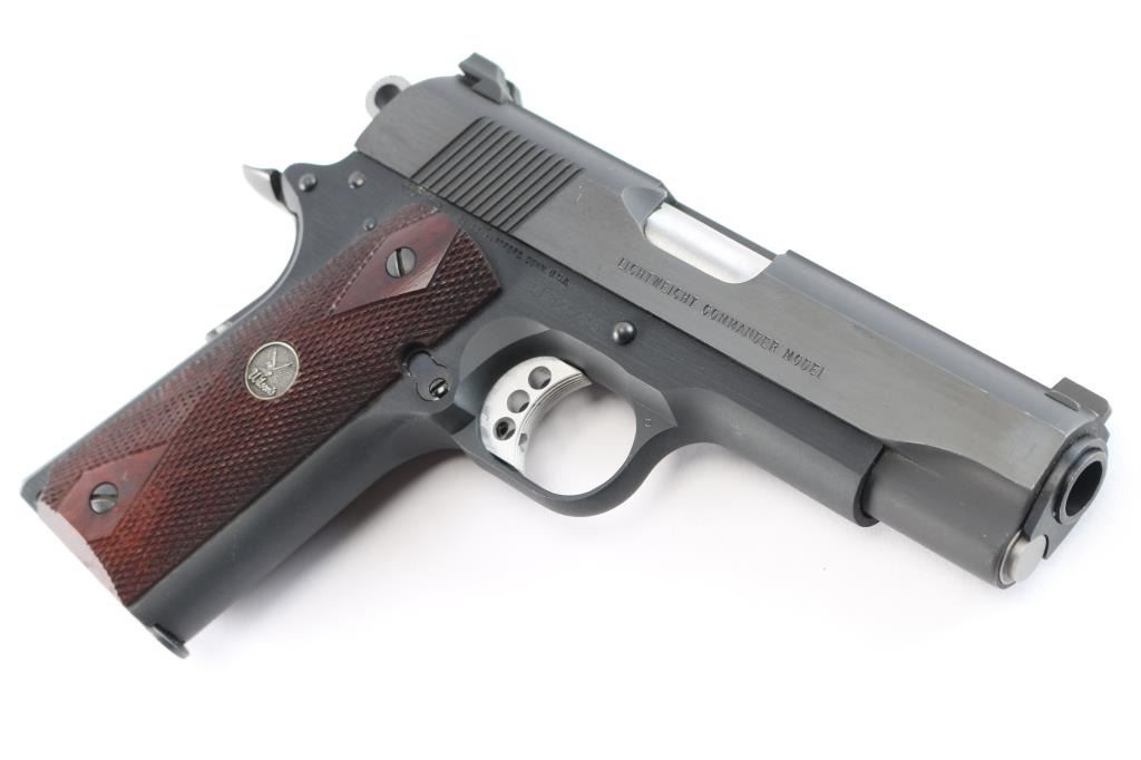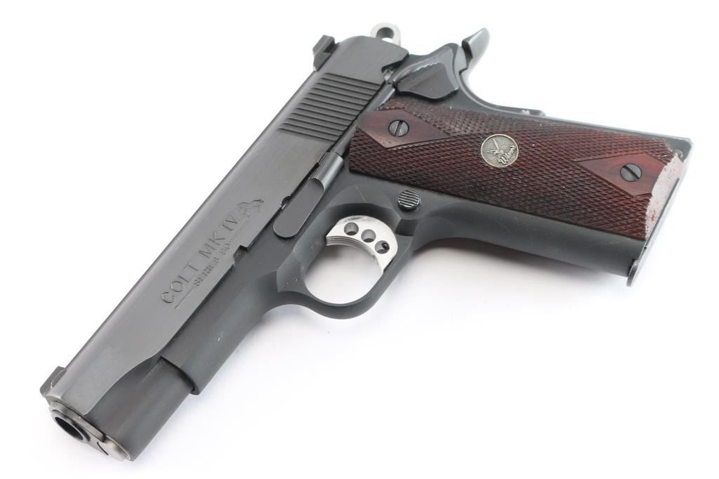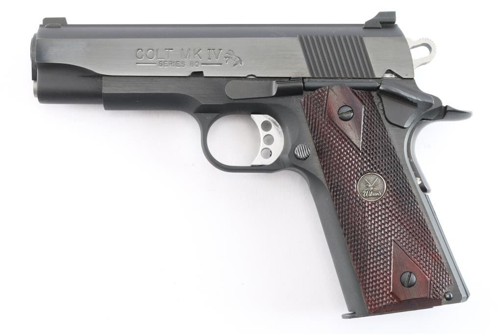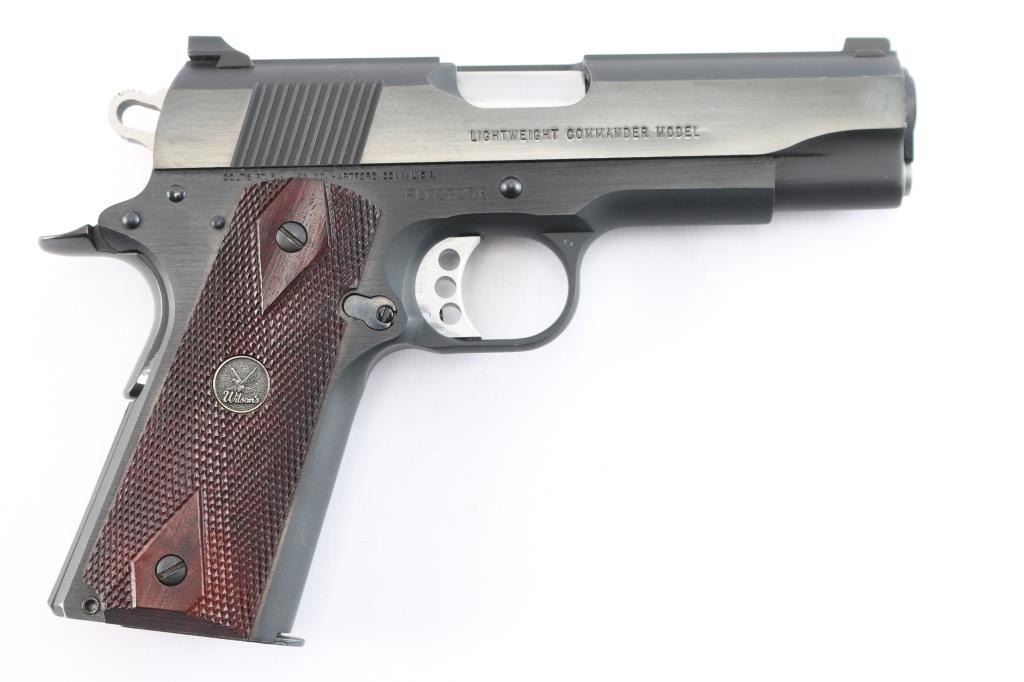 'MK IV Series 80' Colt commercial Lightweight Commander Model, a single action semi-auto pistol chambered for .45 Automatic Colt Pistol, manufactured circa 1994 in Hartford, CT. The 'Series 80s' Lightweight Commanders were produced from 1983-1997. Pistol features a blued finish with polished flats and matte contours, 4-1/4" barrel, raised and beveled ejection port, smooth front strap, undercut and beveled trigger guard, serrated flat mainspring housing, smooth extended 'beavertail' grip safety, serrated slide stop, serrated frame mounted safety, skeletonized two-toned hammer, serrated hammer spur, skeletonized serrated aluminum adjustable trigger, dovetailed blade tritium front sight, dovetailed ramped and notched tritium rear sight, short single-piece metal guide rod, smooth recoil spring plug, and two-piece checkered hardwood grips with gold-toned Wilson Combat medallions. The frame is anodized aluminum with the remainder of the firearm being steel. The original blued finish retained is approximately 98% with a few light scattered scratches. The frame is also excellent with a few minor scattered scratches. Metal displays no rust or deformation. The bore is bright with strong rifling, and the grips are excellent. The action is smooth and crisp.