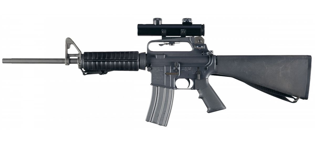 Post-ban lightweight AR-15 type carbine. Standard post front sight with M16A2 style rear sight adjustable for windage and elevation. Mounted with a Colt 4 X 21 illuminated scope. Standard and carbine length handguards with fixed pistol grip and A2 style buttstock with compartment. The lower receiver is marked with the Rampant Colt, "MATCH/TARGET/LIGHTWEIGHT". Complete with manual, maintenance pouch with cleaning kit, eight 30 round magazines, two 5 round magazines, field repair kit and a sling.