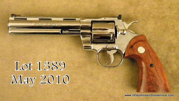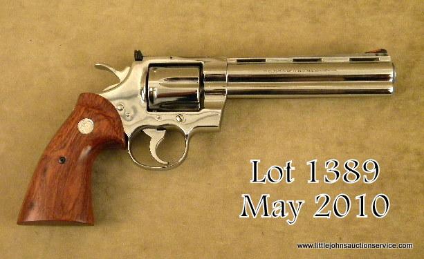 Colt Limited edition Double Diamond Model DA revolver, .357 Magnum cal., 6” barrel, nickel finish, smooth Colt medallion wood combat grips, #DD0125 with original factory cardboard box numbered to this gun. This gun is in overall fine condition showing approx. 99% original finish and little use or handling; the bore is excellent, action fine, markings excellent and grips fine with beautiful graining. The box includes instructions and related paperwork and has somedamage with one end flap area and the flap is separated but present and otherwise overall good condition. Est.: $750-$1,500.