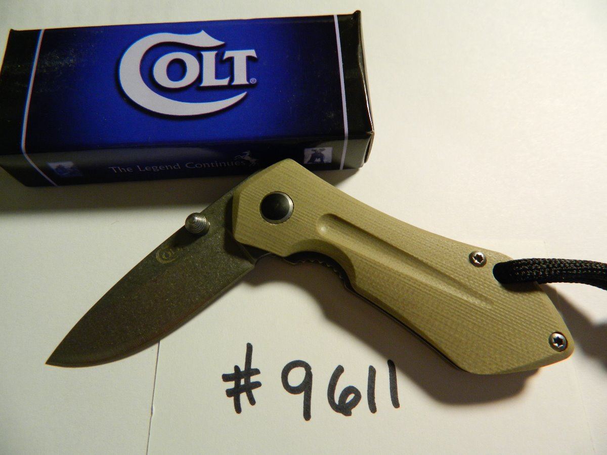 Linerlock Tan G10 - 3 1/8" closed. 2" stonewash finish stainless blade with dual thumb studs. Tan G10 handles. Black cord lanyard.