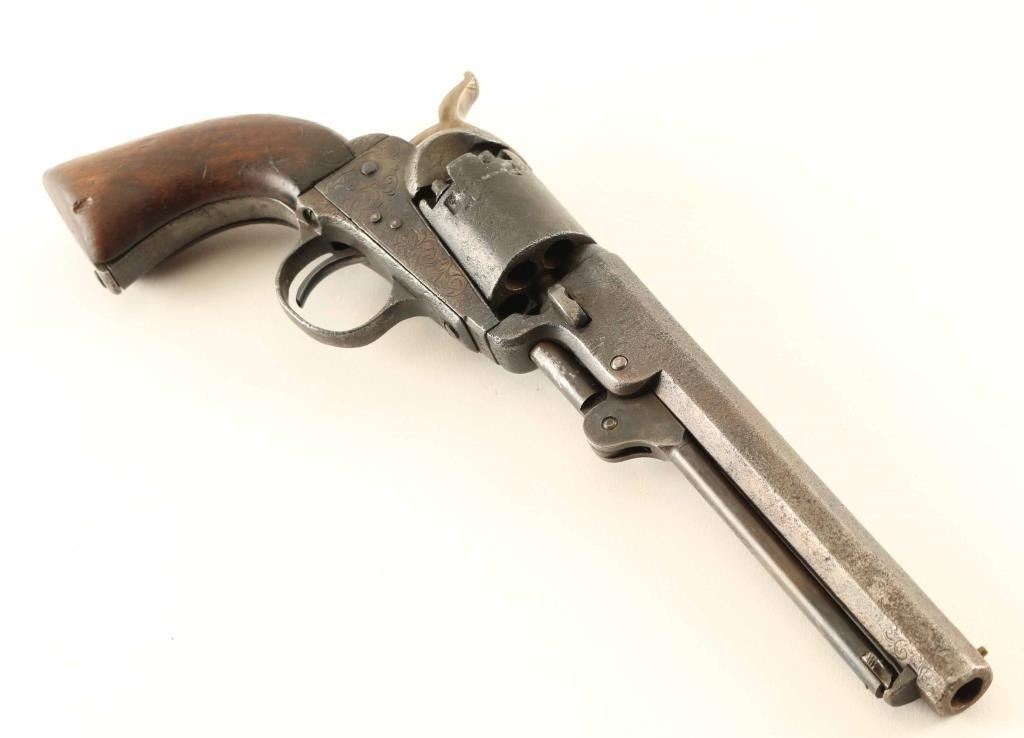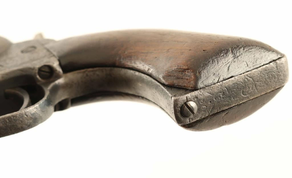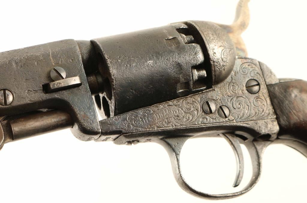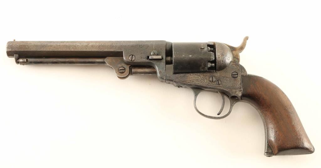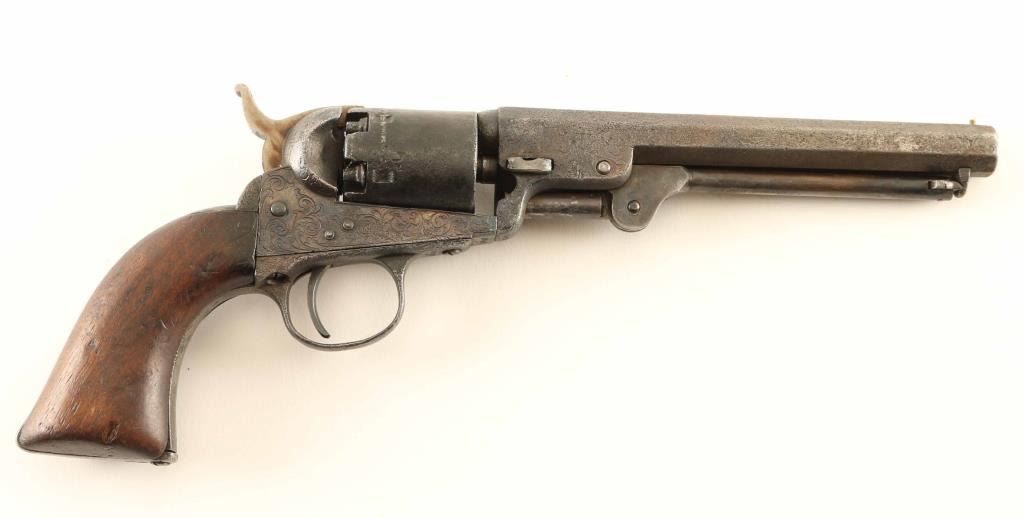 Salvaged engraved London series small frame single action revolver chambered for .31 caliber ammunition, manufactured circa 1854(second year production). Approximately 11,000 London 1849 Pocket revolvers were produced, a diminutive number when compared to the 325,000+ American units manufactured. This revolver features factory style scroll engraving, 6" octagon barrel marked with the standard London two-line address(though it is mostly illegible), brass post front sight, 'v' notch rear sight cut into the hammer, non-fluted six-shot cylinder no observed scene, loading lever, smooth thin trigger, knurled hammer spur, large oval steel trigger guard, steel backstrap and one-piece walnut grip. The cylinder pin, loading lever, trigger and hammer are modern production replacements. The original serialized parts are the barrel, frame trigger guard and backstrap, all of these bear a punched dot under the serial number. The cylinder and grips appear period but lack marks to prove their originality to the revolver. The barrel is proofed with the London proofs "[Crown]/V" & "[Crown]/GP" and the frame is marked "Colt's Patent" in old English letters within a banner. The original metal surfaces show traces of on old refinish with pitting found throughout but more so on the barrel. The modern replacements show nice case colors. Action is in working order, the bore shows good rifling & scattered light pitting, markings are fair and the walnut grip is near good with an old chip at the toe on the left side. Condition is near NRA Good. ***Antique Firearm***