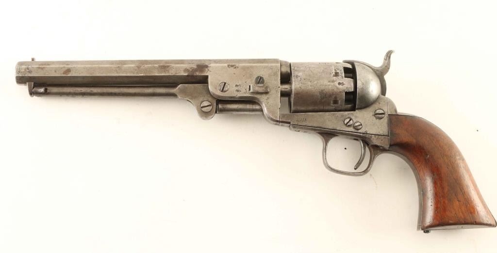 Antique single action percussion revolver chambered for .36 caliber ammunition, manufactured in London, England circa 1855. Features a blued & case hardened finish, 7.5" octagon barrel marked "-ADDRESS COL. COLT LONDON-", loading lever, six shot non-fluted cylinder with roll stamped naval engagement scene, smooth trigger, steel oval triggerguard, knurled hammer spur, steel backstrap and varnished one-piece walnut grip. Shows period English proofs on the cylinder & barrel. All observed serial numbers are matching but no number was found on the base pin. Also the wedge screw is a new replacement. The metal surfaces display an aged light grey patina showing dings, some rust and traces of original finish in the protected areas. Action is sound, the bore is very good, markings are clear, the cylinder scene is approximately 50% intact and the wood grip is very good with some varnish retained. Condition is NRA Very Good. ***Antique Firearm***