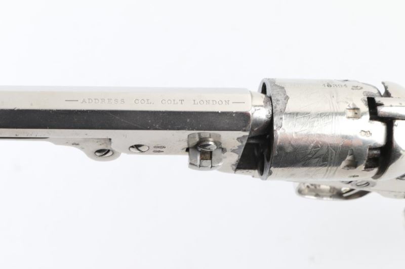 Single action percussion revolver cased set. Features nickel finish, walnut grip, 7.5" octagon barrel, pin front sight, "V" notch rear sight on hammer nose, 6 shot unfluted cylinder with naval battle scene. Revolver has Colt London address on barrel, marked crown over "V" and crown over "P". Numbers match. Backstrap inscribed (appears to be a factory marking) "Sammy from Uncle John". Bore and charge holes are fair or better, dark with patina, revolver not disassembled for inspection. Nickel finish is overall good condition, with 75% coverage, bright with little cloudiness, showing peeling and flaking around breech area, barrel wedge, screw hole, front edge of cylinder, backstrap. Cylinder scene is overall sharp & clearly visible. Wood is very good condition with handling marks. Action is smooth with tight lock-up. Includes English style fitted wood case with hinged lid & green velvet lining, overall very good condition. Case components include powder flask, bullet mold, cap tin, screwdriver & nipple wrench combo tool, key for lock. Inside lid bears "Wm Moore & Wm Grey" label with London address. Condition is NRA Fine *** Antique Firearm ***