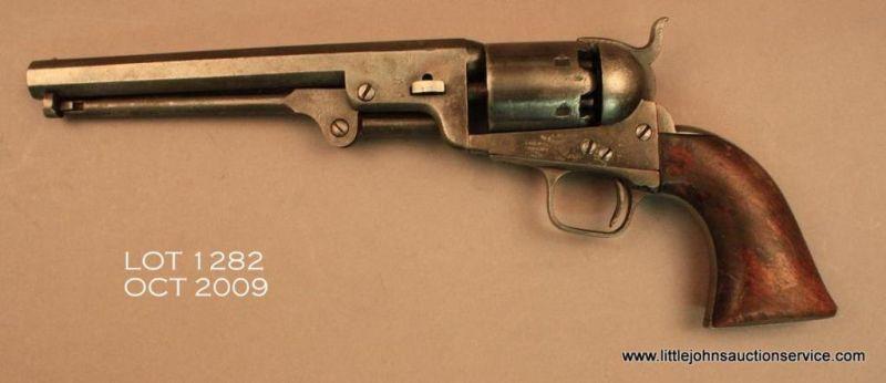 Colt London address and English proofed Model 1851 Navy percussion revolver, .36 cal., 7-1/2” barrel, wood grips, #31072 on all visible parts. This gun is in overall fair + condition showing scattered light to moderate pitting on metalsurfaces that have been cleaned some time ago and have gone back to a dark patina; the bore is dark, the action good, markings are good, no cylinder scene remains, the grips are overall good with scattered nicks and mars from carry and storage;iron trigger guard and backstrap. Est.: $700-$1,400.