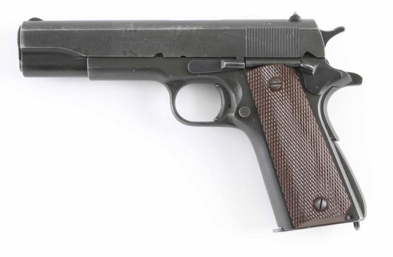 Pistol. Semi-Automatic. U.S. Military pistol manufactured the fourth year of WW2 in 1944. Magazine fed, short recoil. 5" Barrel. Slide mounted front blade and U-notch rear sights. Parkerized "Wartime" metal finish. Grip safety. Lanyard ring. Barrel stamped "Colt 45 Auto" , with "7". Right frame stamped , to the rear of the slide stop pin is "United States Property" with the serial number below it. "M1911A1 U.S. Army" is stamped to the front of pin. At the rear of the right frame is the crossed cannon Ordnance stamp. Left side of frame is stamped with the 2-line patent dates, a "Rampant Colt", and Colts 2-line address. "P" is stamped in front of the rear sight, and below the magazine release button. No serial number on the slide. Right triggerguard is stamped "93" "G.H.D inspectors stamp is present below the slide catch. (Col. Guy H. Drewry) Brown checkered plastic are reinforced , and appear original to the pistol. Bore is excellent/bright, but a little dirty. Slide action is smooth/tight. Metal finish is about 75% with edge wear, and some scratches. Comes with original unmarked magazine. NRA Condition-Good. C&R Firearm.