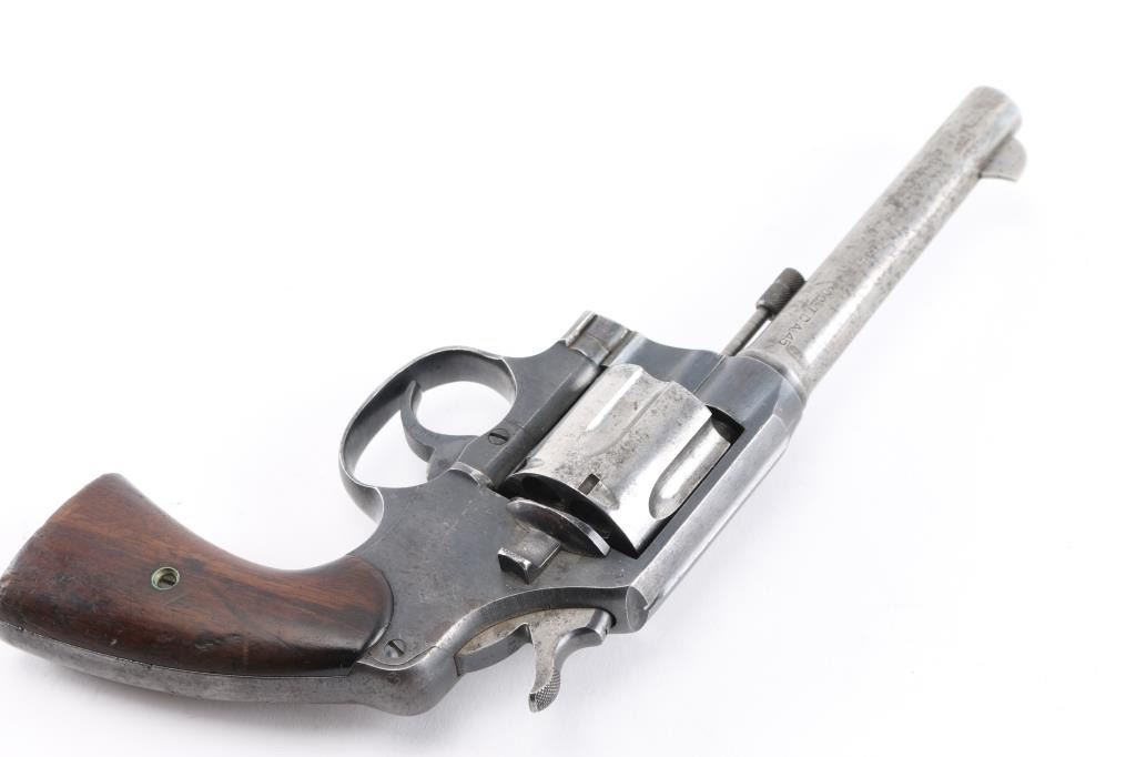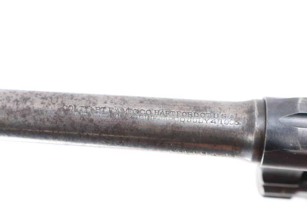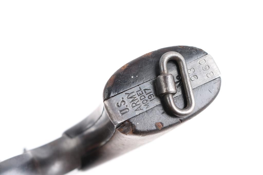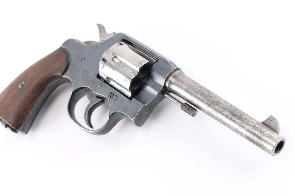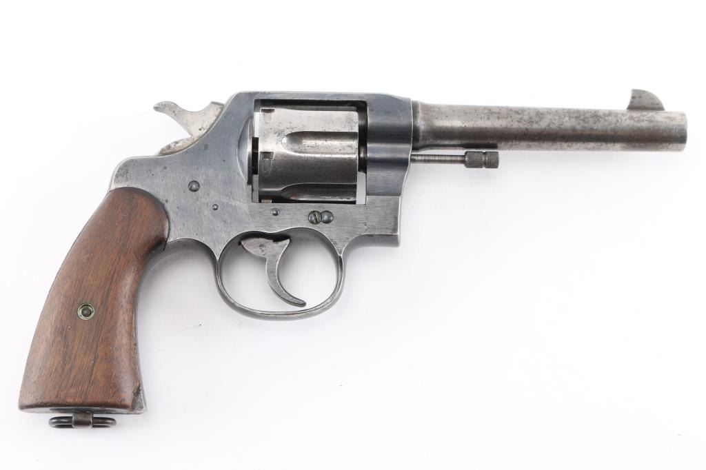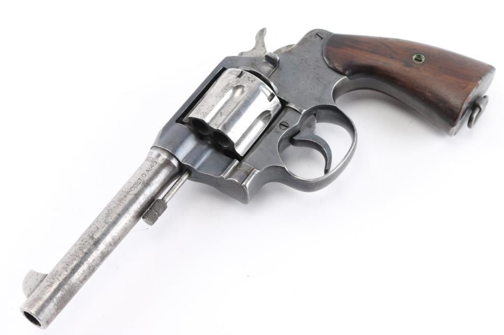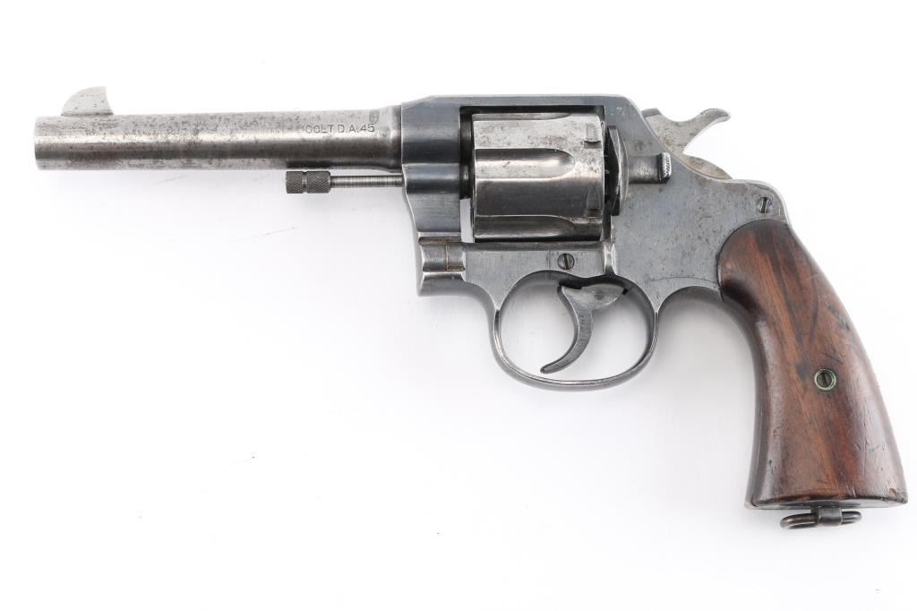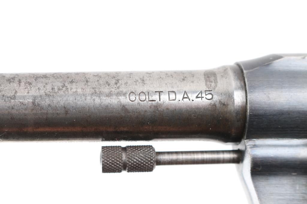 U.S. Military large frame double-action service revolver chambered in .45 Automatic, manufactured in Hartford, CT circa 1919. Features a blued finish, 5.5" round tapered barrel, blade front sight, rear of blade painted white,"u" notched rear sight, fluted six-shot swing-out cylinder, non-shrouded ejector rod, smooth trigger, checkered hammer spur, steel frame with lanyard ring on the butt, and correct smooth wood grips. Markings: Frame-“S/18" under eagle head, “U.S./ARMY/MODEL/1917" & "No 93/860", and "Rampant Colt"on left frame. Barrel - "UNITED STATES PROPERTY", "COLT'S PT FA. MFG. CO. HARTFORD CT U.S.A./PATD AUG 5.1884 JUNE 5 1900 JULY 4 1905" a little faint & "COLT D.A.45". Matching serial numbers. Revolver retains approximately 40% of its blued finish showing the barrel and cylinder mostly in the white having scattered brown patina. The blue on the frame appears to have been buffed at one time. Action is sound with a tight lock-up, the bore appears good, strong rifling with light frosting in the grooves, the markings are clear.