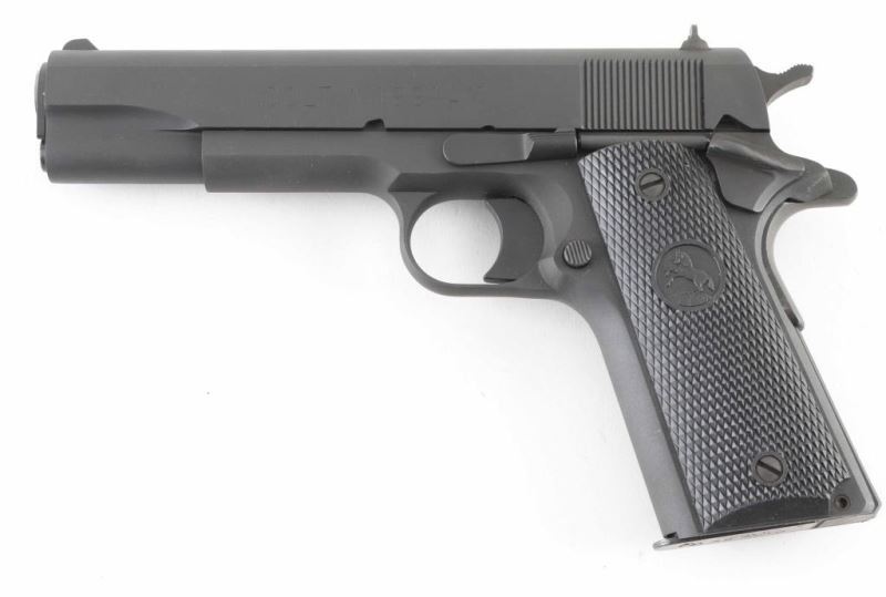 1911A1 pattern single action semi-automatic pistol. Features matte dark gray parkerized finish, 5" barrel, fixed front sight. square notch rear sight, smooth polymer trigger, serrated hammer spur, thumb safety on the left side of the frame, grip safety, push button magazine release, serrated flat mainspring housing, checkered black plastic grips with embossed Colt emblems. Condition is like new with few minor handling marks. Includes (1) magazine, factory hard plastic case & manual. Condition is NRA Excellent - like new *** Modern Firearm ***