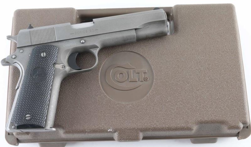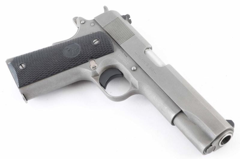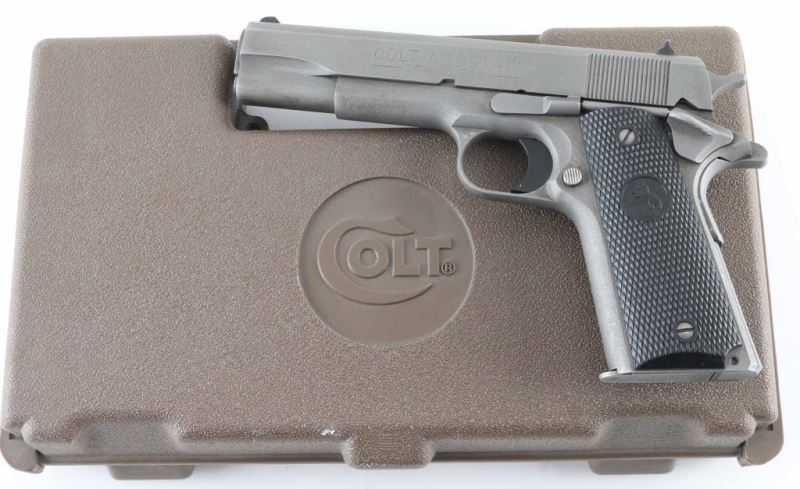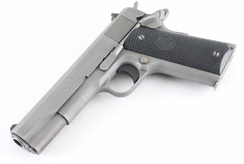 'Stainless' 1911A1 pattern single action semi-automatic pistol. Features matte sand blasted finish, 5" barrel, fixed front sight. square notch rear sight, smooth polymer trigger, serrated hammer spur, thumb safety on the left side of the frame, grip safety, push button magazine release, serrated flat mainspring housing, checkered black plastic grips with embossed Colt emblems. Bore is very good condition. Metal finish is very good condition with scraps & scratches, some edge wear. Grips are very good condition. Includes (1) magazine, manual, Colt brown plastic case. Condition is NRA Very Good++ *** Modern Firearm ***