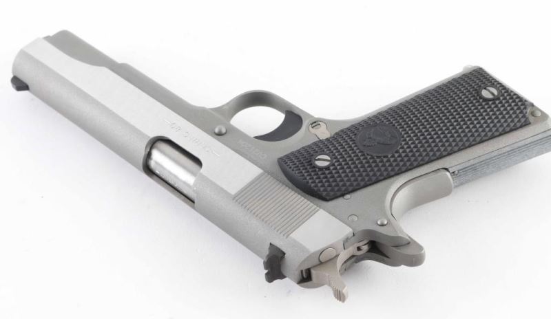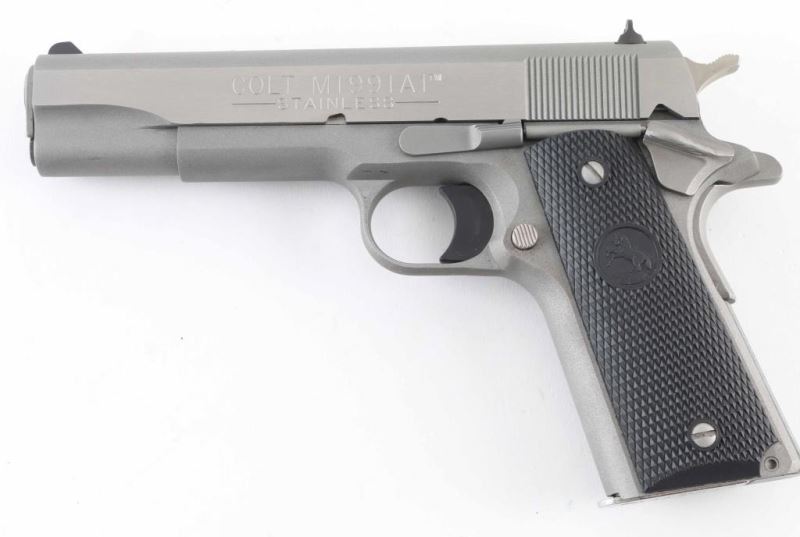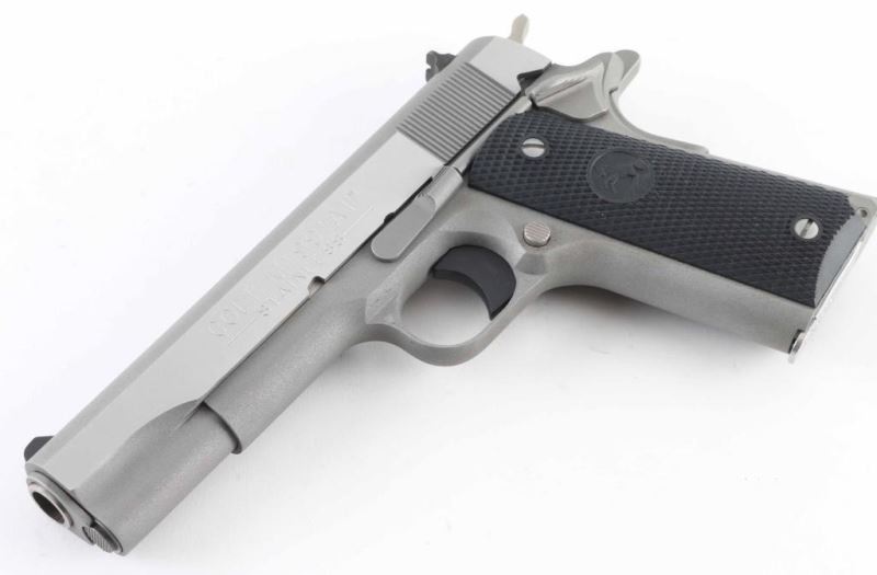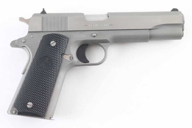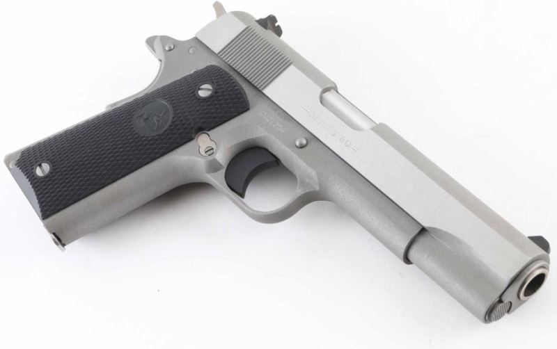 1911A1 pattern single action semi-automatic pistol. Features matte stainless steel finish, bright polished flats on slide, 5" barrel, fixed front sight. square notch rear sight, smooth polymer trigger, serrated hammer spur, thumb safety on the left side of the frame, grip safety, push button magazine release, serrated flat mainspring housing, checkered black plastic grips with embossed Colt emblems. Condition is like new with few minor handling marks. Includes (1) magazine, factory hard plastic case & manual. Condition is NRA Excellent - like new *** Modern Firearm ***