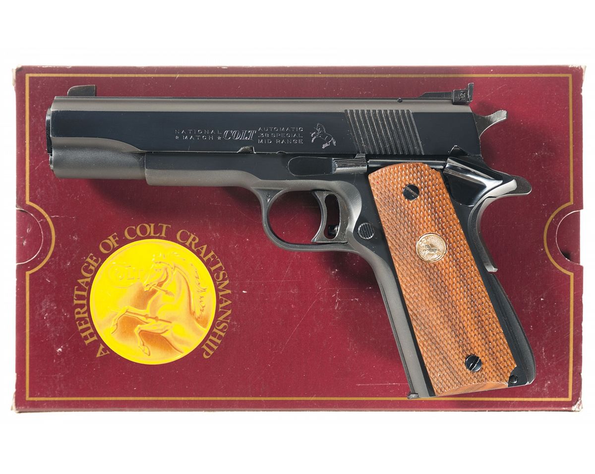 Manufactured circa 1972. The wide adjustable trigger, magazine release, hammer, thumb safety, slide stop and arched mainspring housing are all serrated. With maroon Colt box numbered to match gun.
