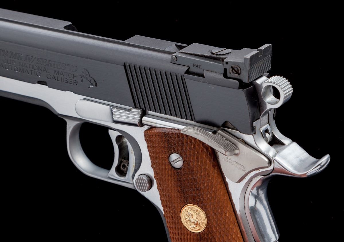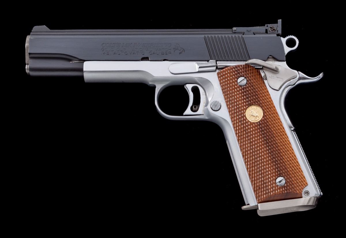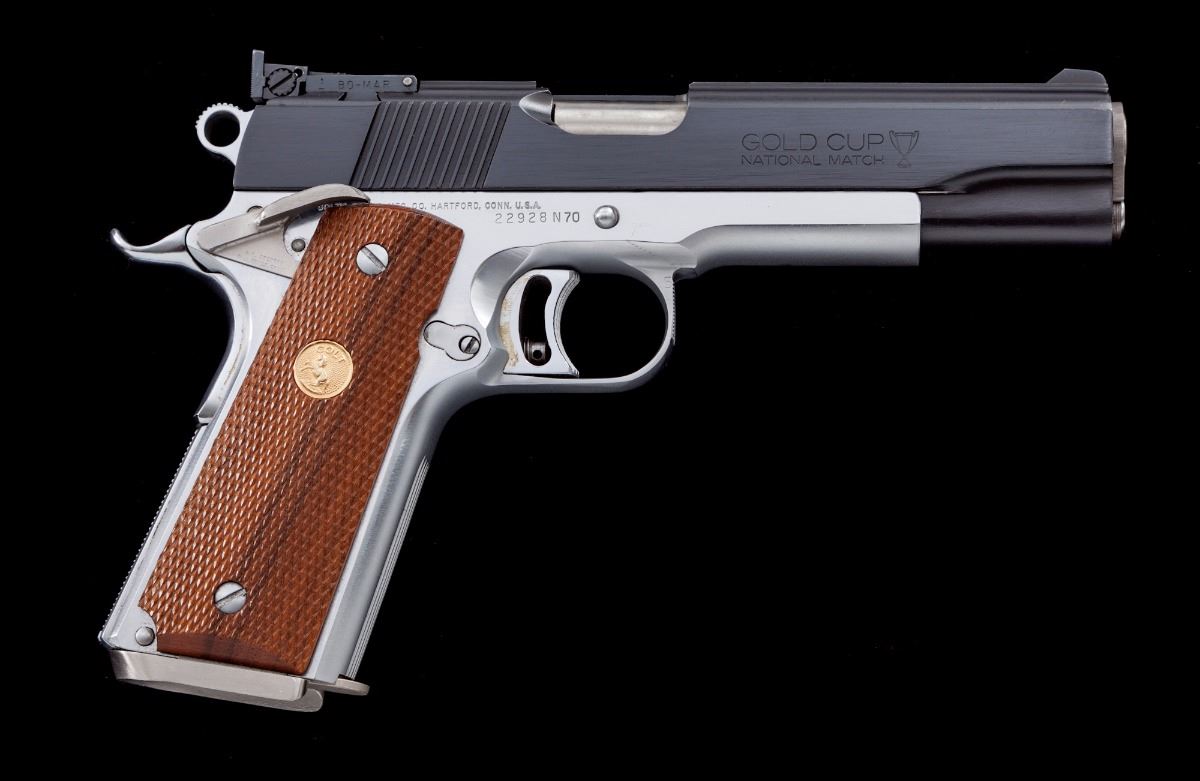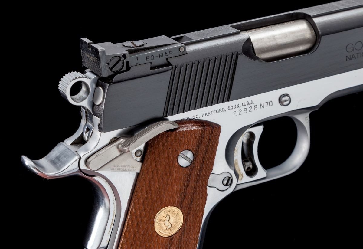 Colt MK IV Series 70 Gold Cup National Match Semi-Automatic Pistol, #22928N70, .45 ACP cal., 5'' Bar-Sto barrel, Bomar sights, two-tone finish, factory checkered walnut grips with medallions, flat checkered mainspring housing, Swensen ambidextrous safety, beavertail grip safety, and Commander style hammer, with one satin nickel factory magazine. Condition is excellent showing light range use but retaining approx. 97% original finish. Grips are crisp. Action is smooth and tuned, bore is bright. Est.: $1,500-$2,000. (Modern/PPT)